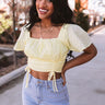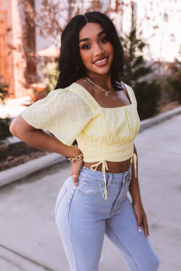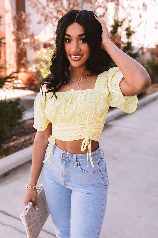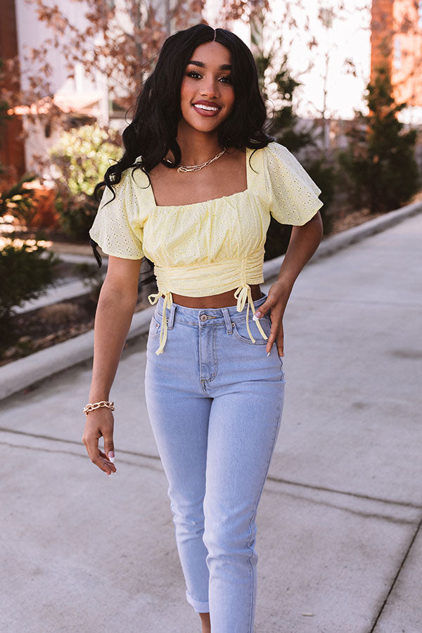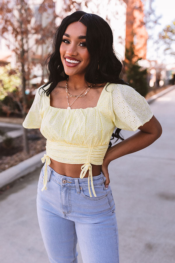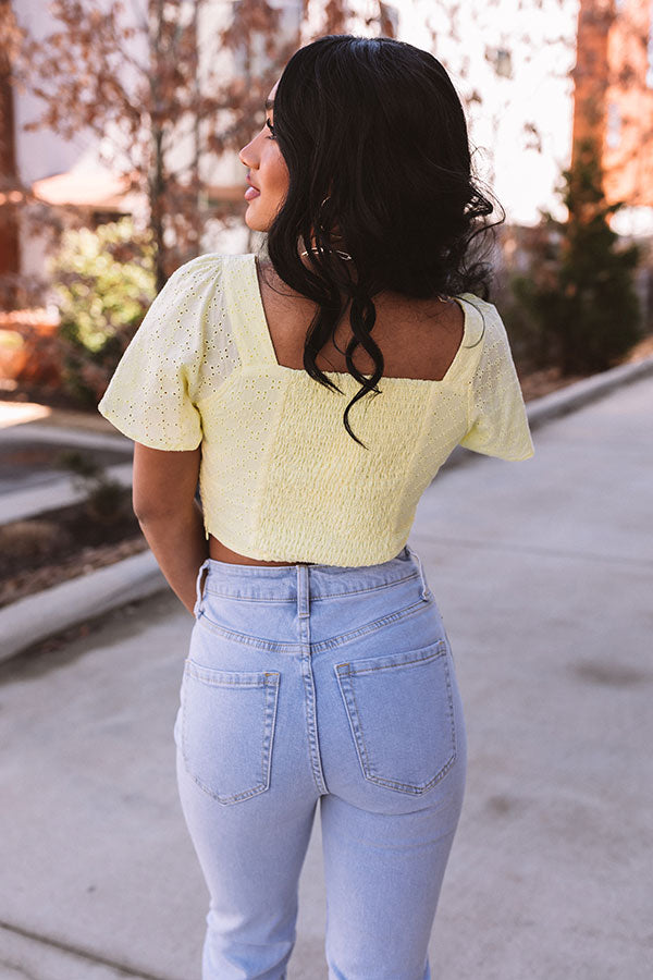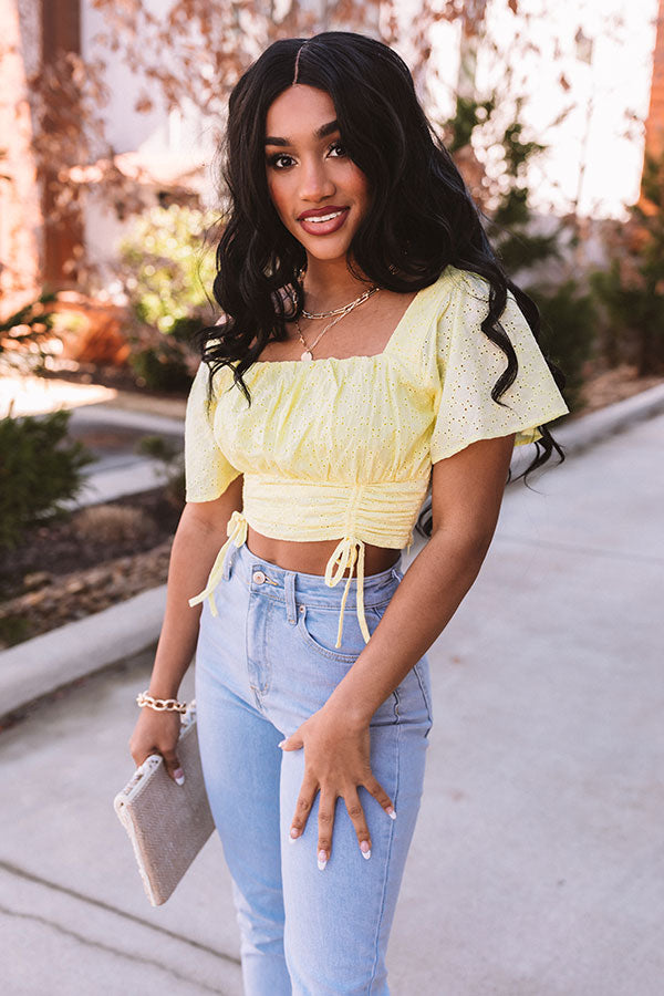 Show off your sunny side with this darling yellow top featuring lightweight material with intricate eyelet detailing, a square neckline and upper back, flowy cap sleeves, and a flattering bodice with cinched detailing that ends in a straight cropped hemline!