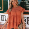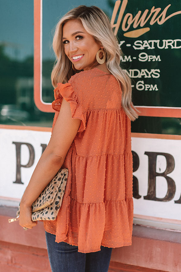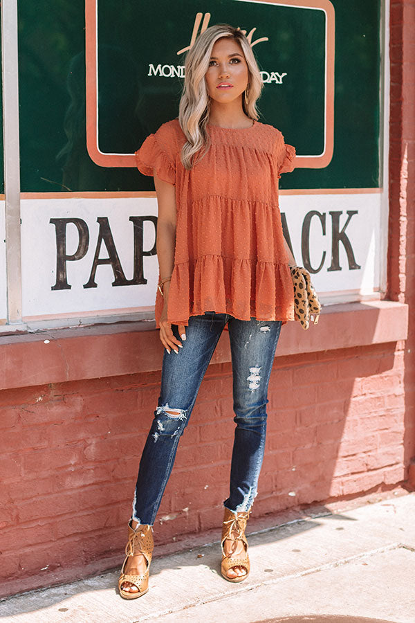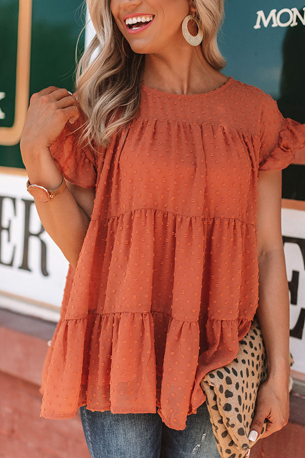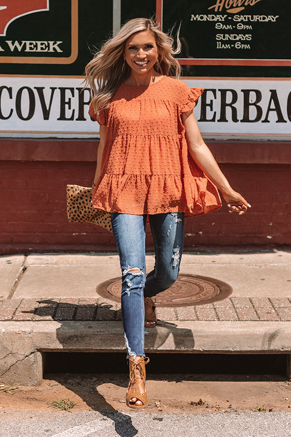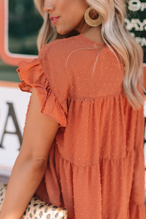 People will see your "sweet side" when you wear this pumpkin colored shift top featuring a tiered flowy bodice that falls into an uneven hemline, a subtle polka dot texture, ruffled short sleeves, a high rounded neckline, lightweight material, and a keyhole accented cutout with a two button closure! You can style this piece for summer when you wear it with distressed skinnies, a neutral cutout wedge, and leopard clutch, and you can transition to fall when you pair it with our "Rock And Roll Frayed Mini Skirt" and "The Lynn Over The Knee Boot in Warm Taupe!" Measurements