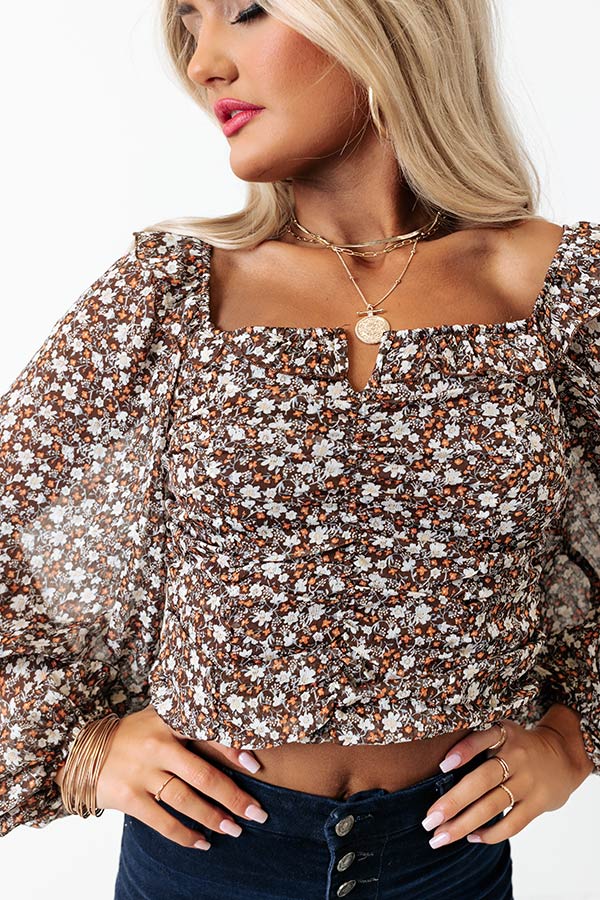 You are sure to love this darling brown top with your whole heart! It features lightweight material patterned with a cream and orange hued floral print, a ruched center front with a square neckline and upper back, long oversized sleeves, and a flattering figure hugging silhouette that ends in a straight hemline!
