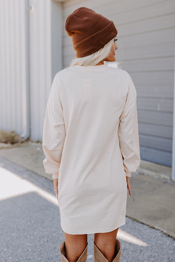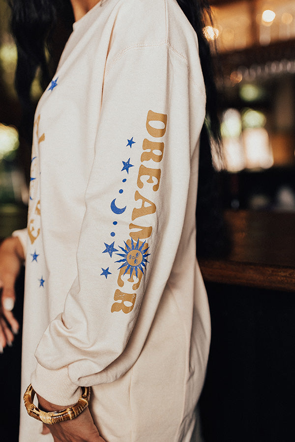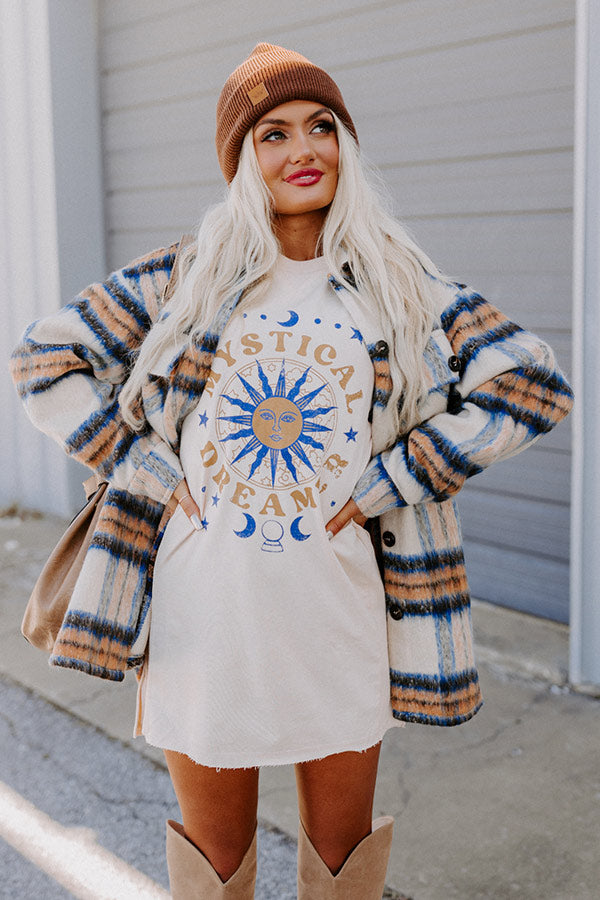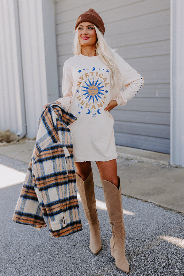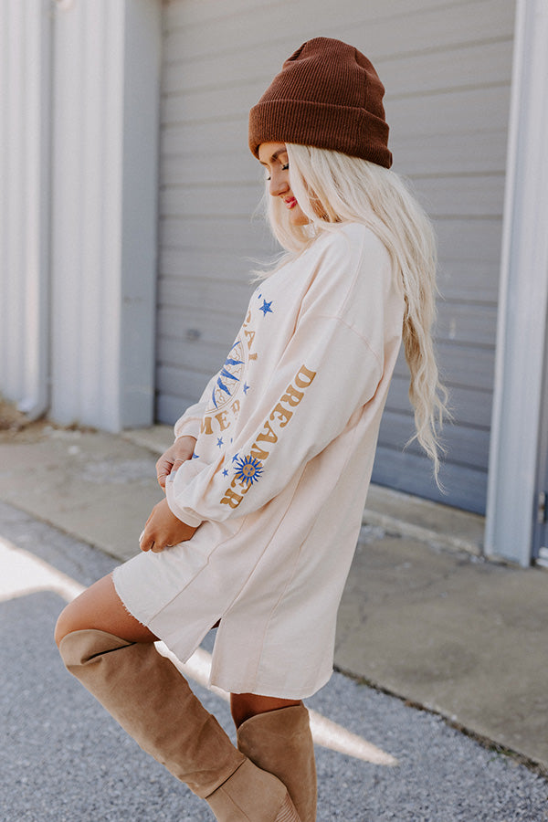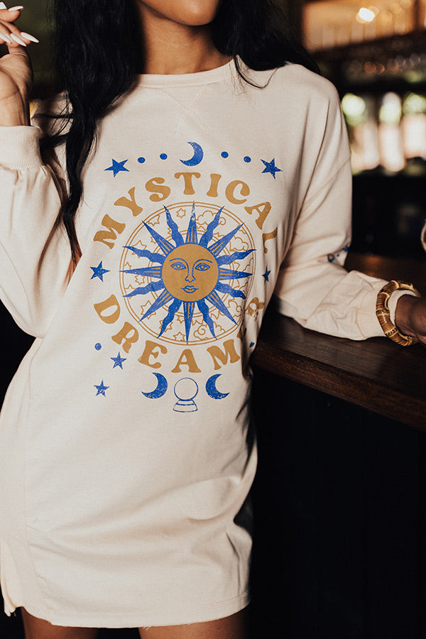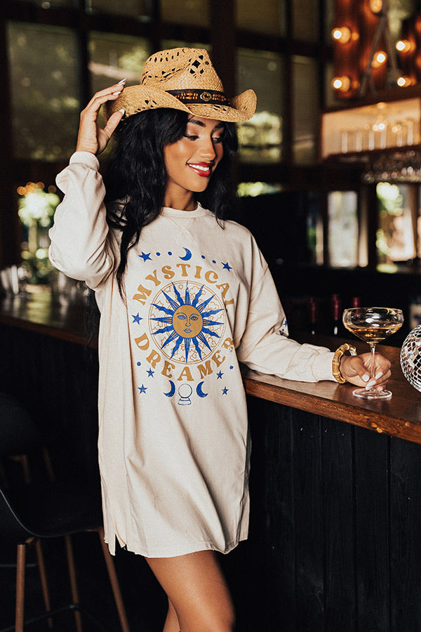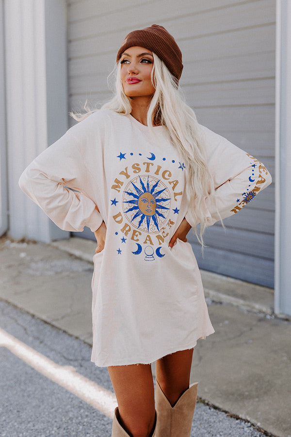 Keep comfortable in our cute light beige hued 'Mystical Dreamer' t-shirt dress featuring soft lightweight material with a cute blue and mustard sun graphic on the front, a rounded neckline, long loose sleeves, and a relaxed silhouette that ends in a straight mid-thigh length raw-cut hemline with accent side notches!