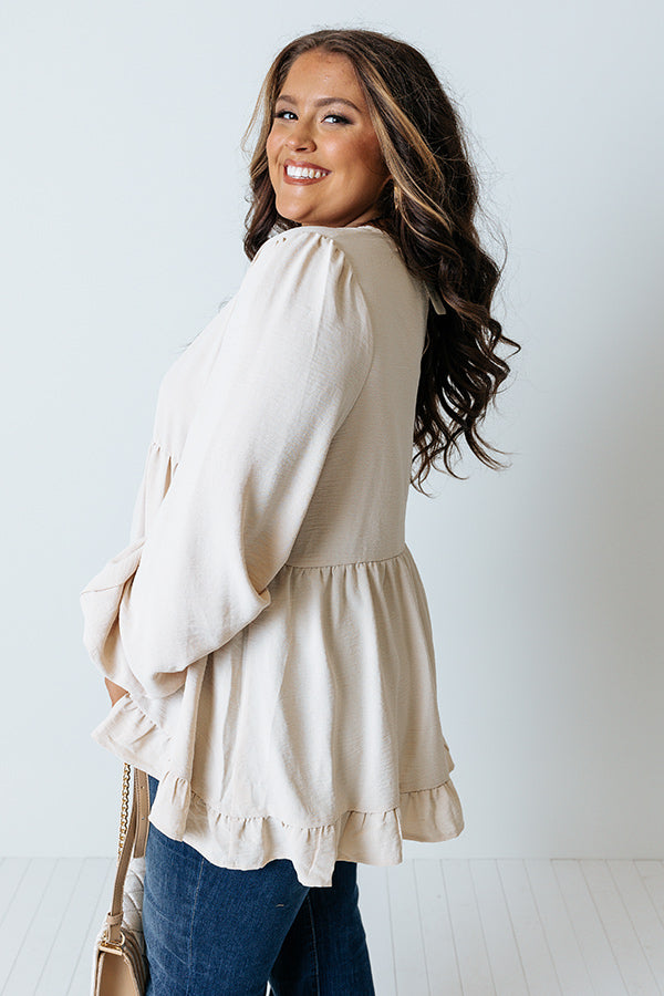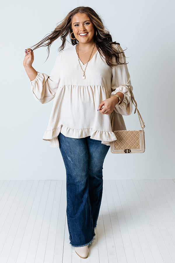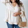 Add a mythical piece to your wardrobe with this pretty plus size cream colored shift top featuring lightweight material, a v-cut neckline, long loose sleeves, a keyhole accented upper back with a button closure, and a relaxed silhouette that falls into a ruffled hemline! Measurements