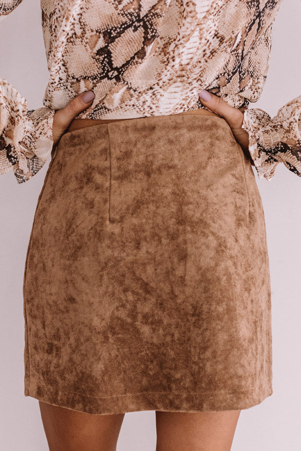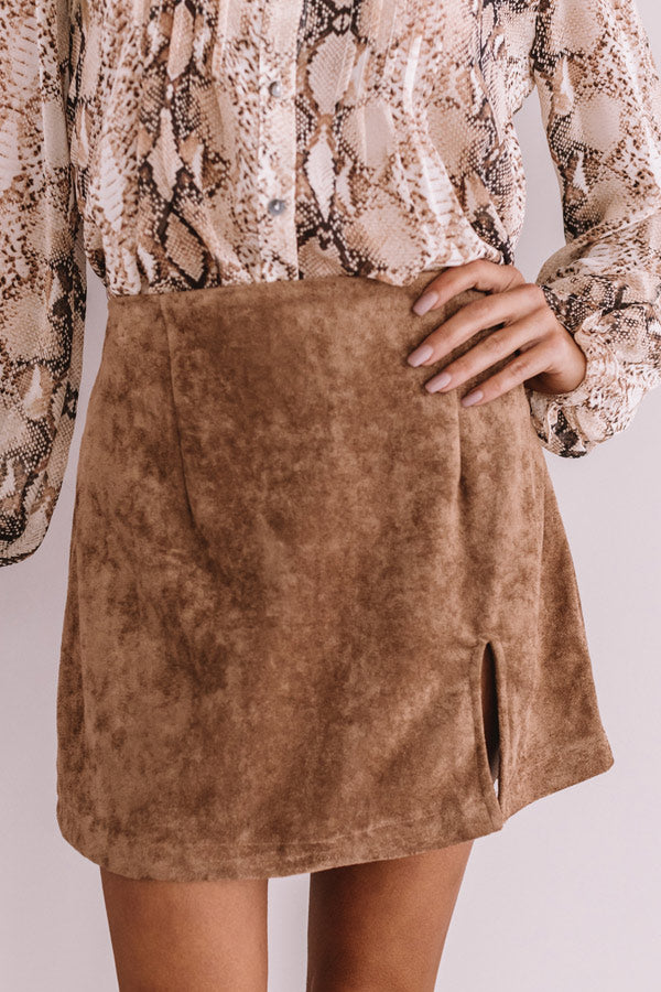 People will be dropping your name and calling you a fashionista when you wear this mocha colored mini skirt featuring soft lightweight faux suede material, a side zip closure, and a form fitting silhouette that falls into a straight upper thigh length hemline with a left thigh slit! We have styled this flirty piece with a snake print top and neutral booties, but you can also wear it with a basic ivory tank, a denim jacket, "The Jess Faux Leather Heel in Natural," an olive backpack, and our "All Caught Up Headband in Ivory!" Measurements