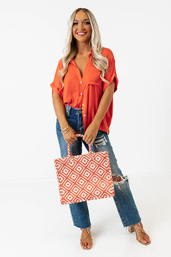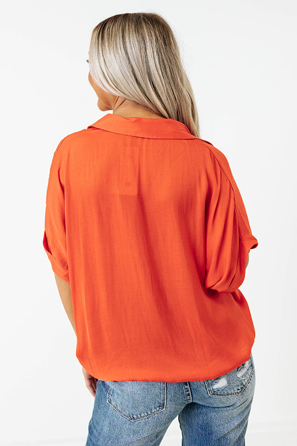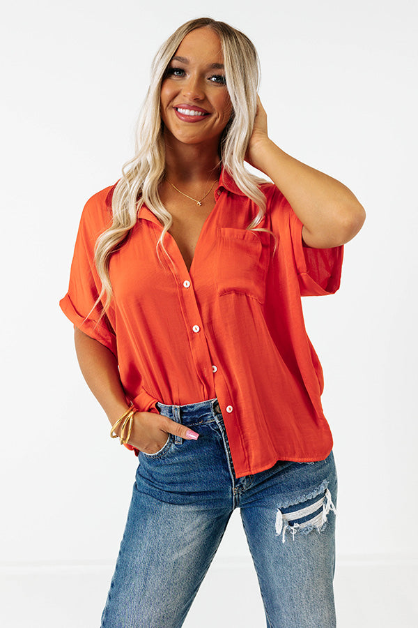A classic fit, our timeless tangerine colored 'Name Of The Game Shift Top' featuring lightweight material, a button down front with a collared v-cut neckline, loose short sleeves with rolled cuffs, a single accent chest pocket, and a relaxed silhouette with a straight hemline!