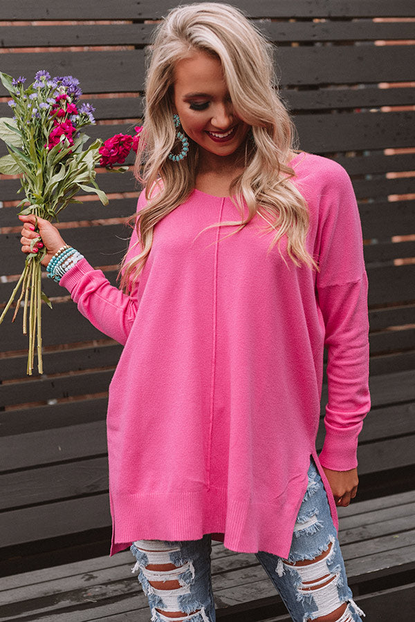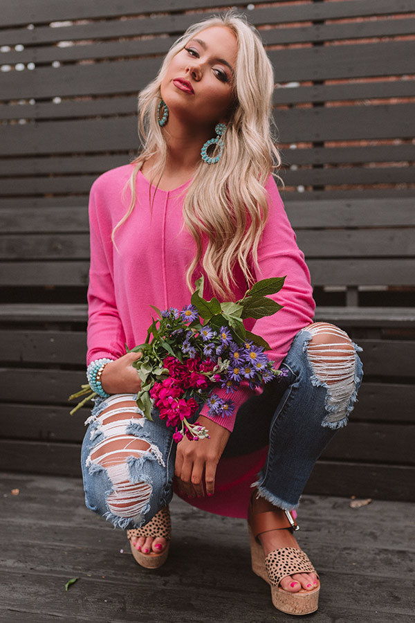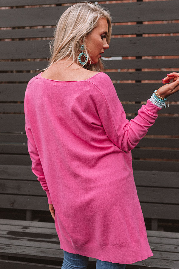 It's undoubtedly a "great idea" to add this adorable pink shift tunic to your cart with its soft lightweight material, a wide v-cut neckline, long loose sleeves, and an ultra relaxed silhouette that falls into a straight upper thigh length hemline with high accent side slits! You can style this spring cutie a variety of ways, like with some distressed ankle jeans, turquoise statement jewelry, and neutral cheetah print wedges, but you can also wear it with some frayed white shorts, "The Kamryn Stripe Sandal in Hot Pink," and our "Right On Cue Fringe Crossbody in White!" Measurements