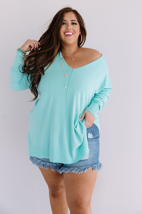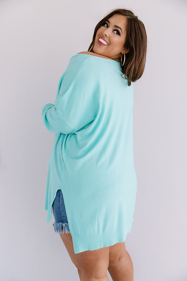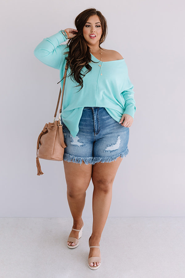 Plus Size - It's undoubtedly a "great idea" to add this adorable turquoise shift tunic to your cart with its soft lightweight material, a wide v-cut neckline that can be worn off one shoulder, long loose sleeves, and an ultra relaxed silhouette that falls into a straight upper thigh length hemline with high accent side slits! You can style this spring cutie a variety of ways, like with some frayed denim shorts and a neutral wedge and bucket bag, but you can also wear it with some white flares, "The Melina Heel in White," and our "Quay X JLO Reina Cat Eye Sunnies in Ivory!"