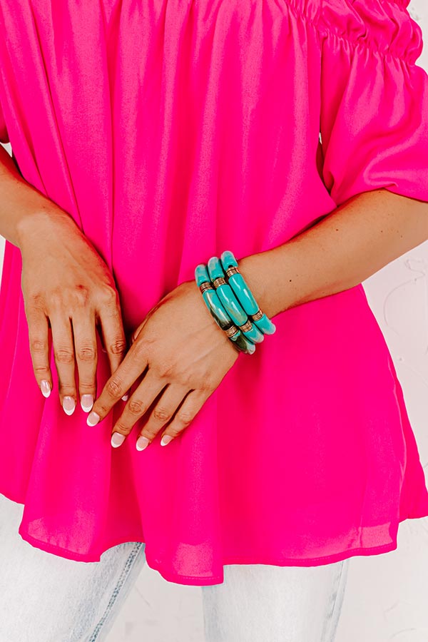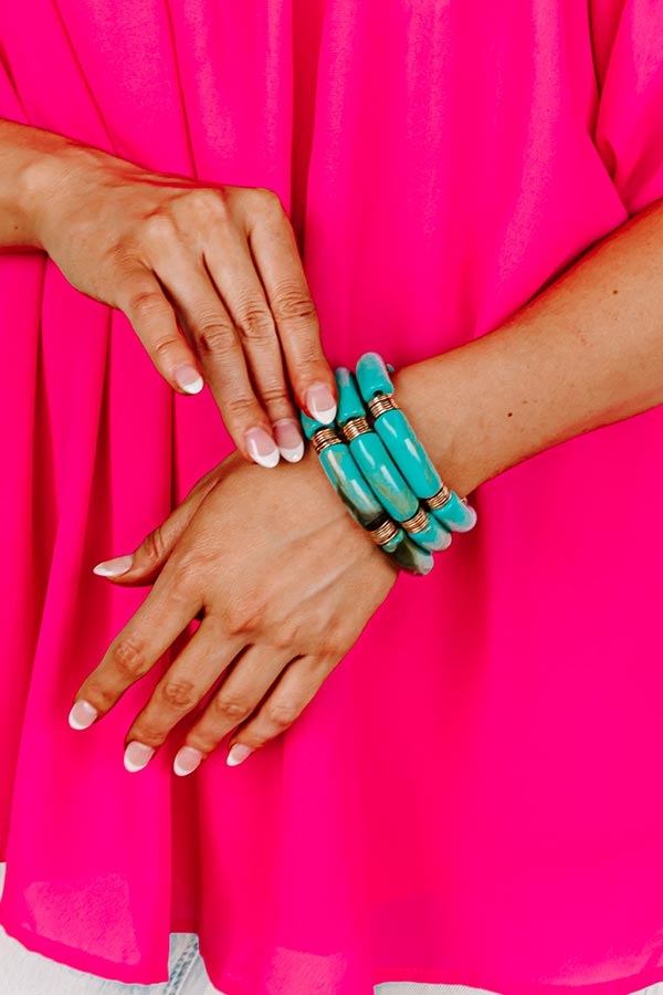 - A stretchy bracelet featuring chunky turquoise hued beads and flat golden accent beads