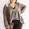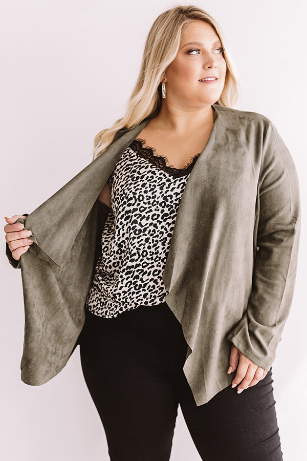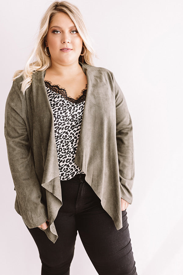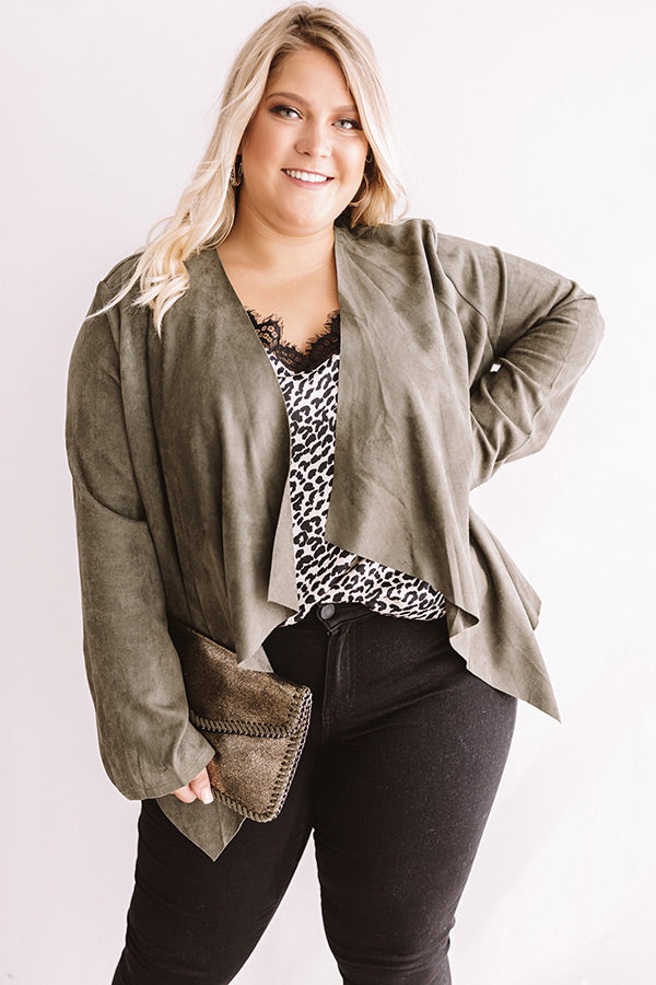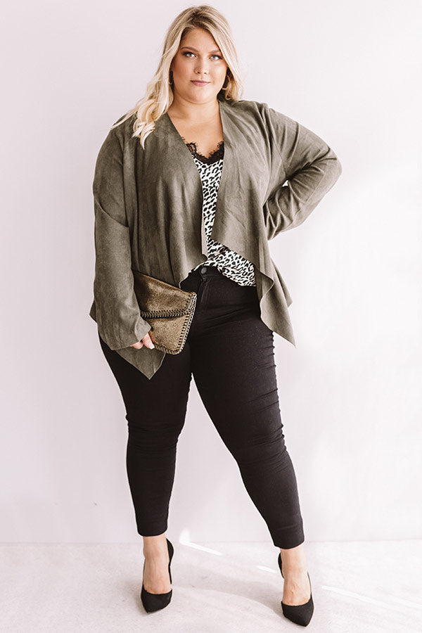 Plus Size - When headed for a "Nashville night out" with your besties, stay looking stylish with this chic olive toned blazer featuring a soft lightweight faux suede material, long semi fitted sleeves, and a relaxed open front flap silhouette that falls into a draped uneven hemline! This piece can be styled for drinks over a bold leopard tank with some black skinnies, hoop earrings, pumps, and a glitzy clutch, or you can style it for the office with a basic taupe camisole, our "Manhattan Meeting High Waist Trousers in Black," and "The Seraphina Faux Leather Wedge in Taupe!" Measurements