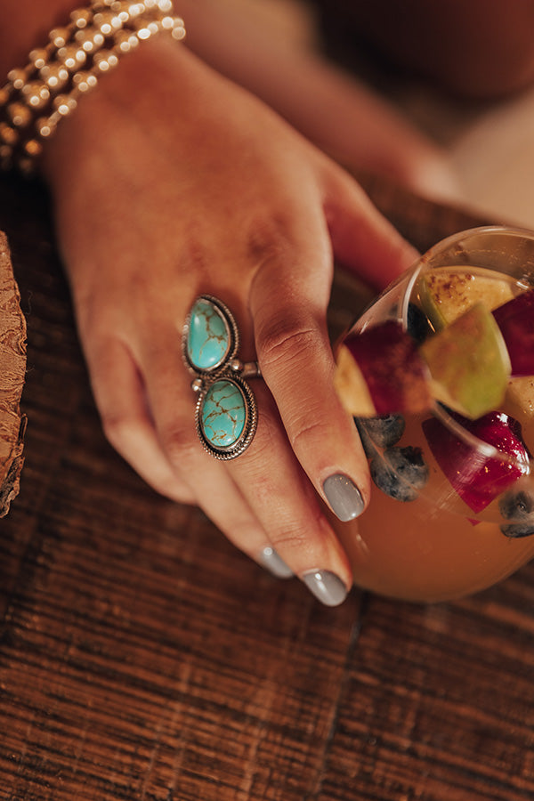 Upgrade your night out look with this beautiful statement ring featuring two oval and teardrop shaped back-to-back turquoise stones inside an ornate silver setting!