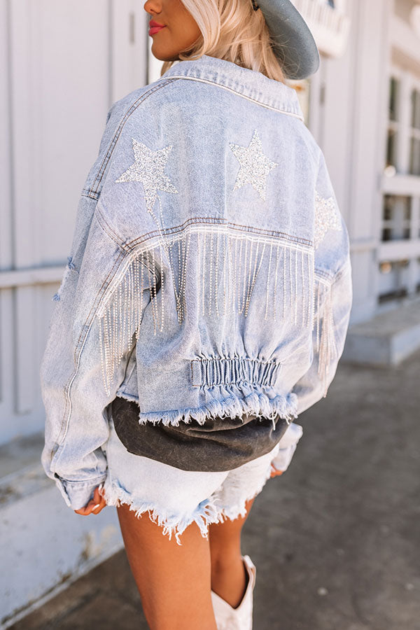 The perfect piece for a girls night out, our adorable 'Nashville Nightlife' jacket features featuring lightweight light wash denim material, a button down front with a collared neckline, two chest pockets with flap closures, long loose sleeves button closure cuffs that can be rolled, star accents across the shoulders with rhinestone fringe detailing, and a relaxed silhouette that falls into a cropped frayed hemline!