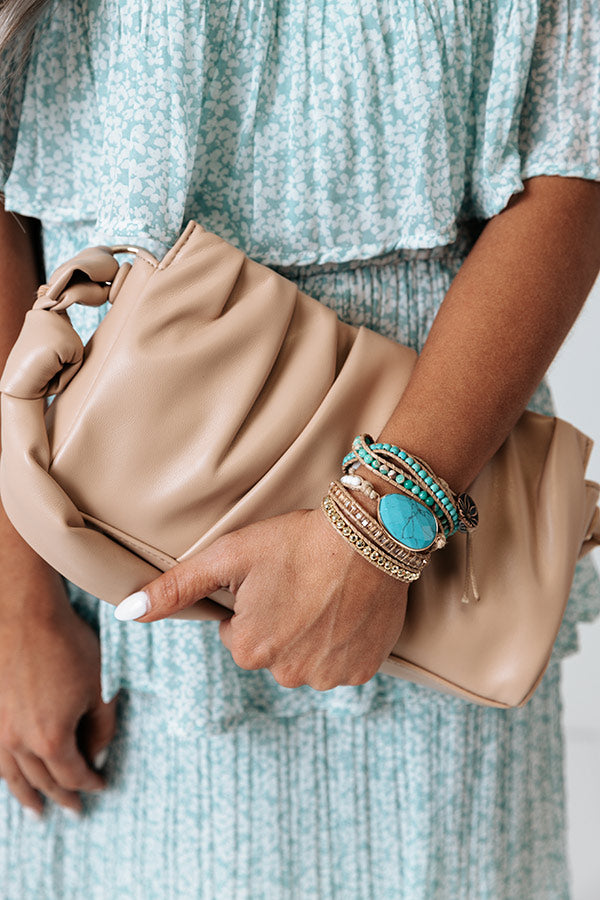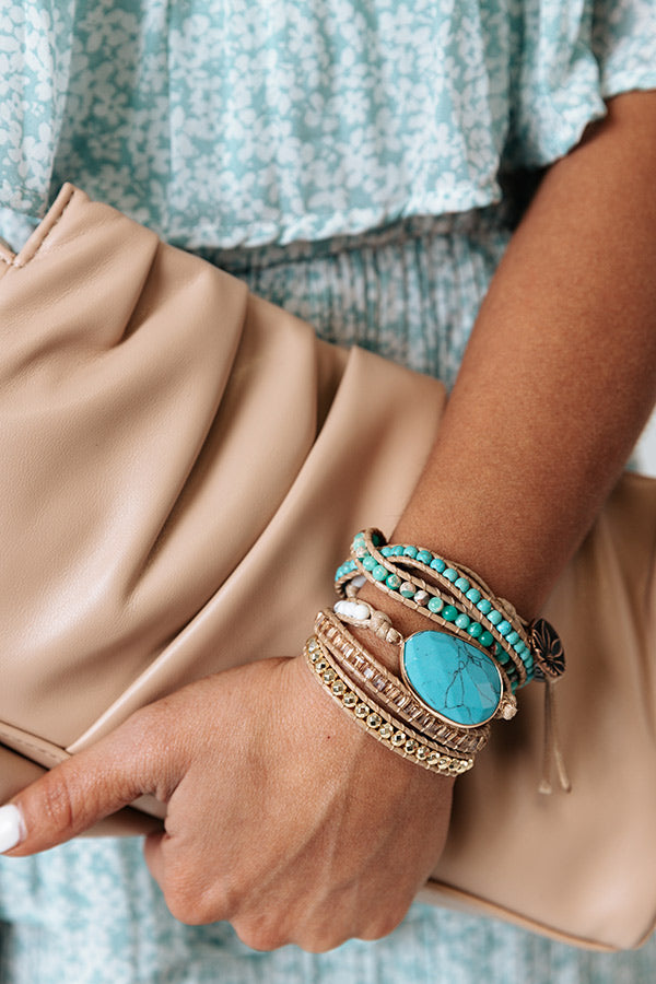 Complete your look in the best way with our luxe 'Nature Walk' bracelet featuring a wrap silhouette with a variety of beads and a large turquoise semi precious stone! Due to the use of natural stones, stones may vary in size, shape or color.