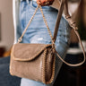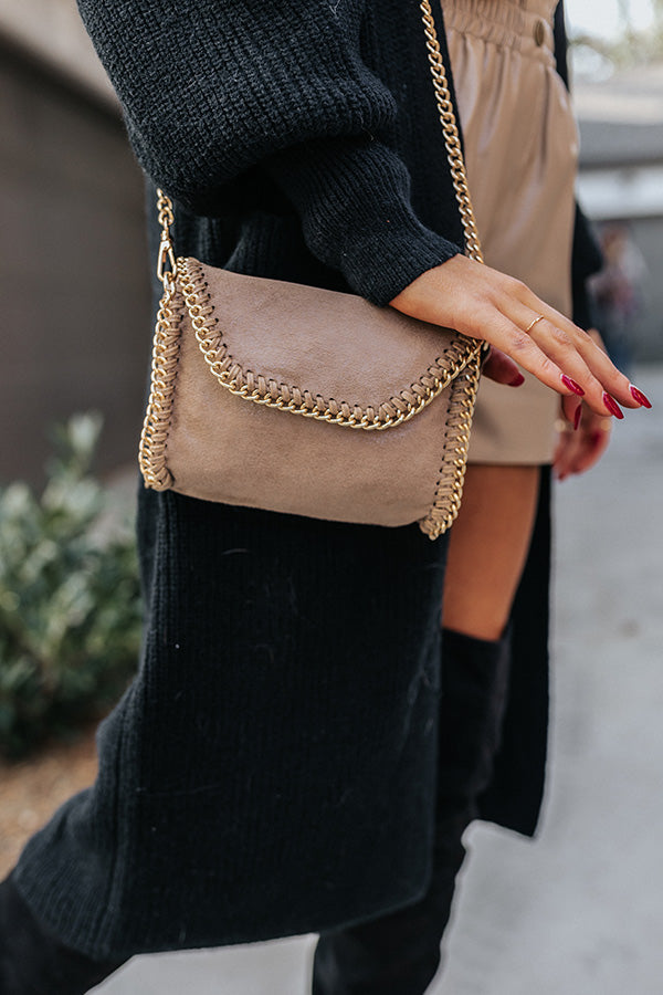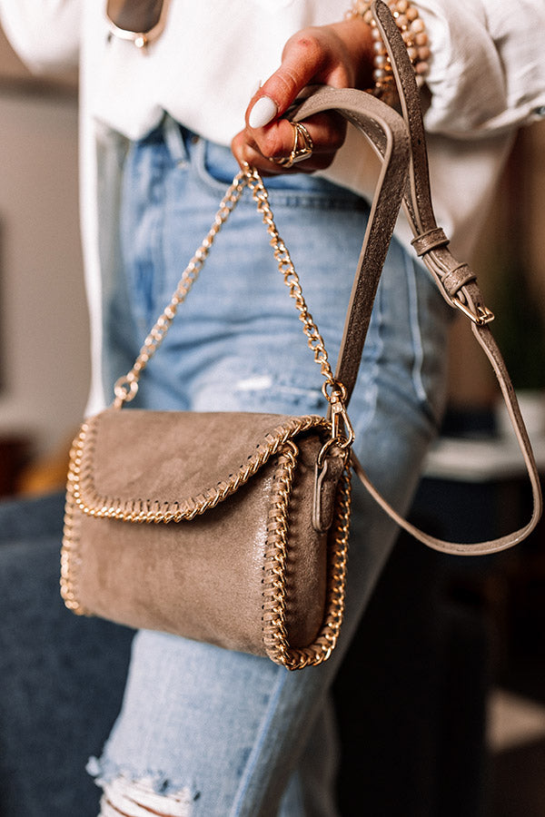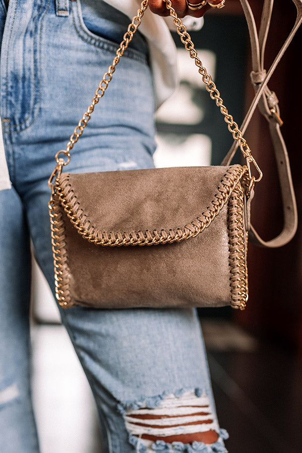The perfect size bag for every occasion, our adorable taupe colored 'Nearly In Love' crossbody features faux suede material with chain trim detailing, a flap closure with a snap button, a removable and adjustable shoulder strap, and a spacious interior with an additional inside pocket!