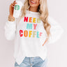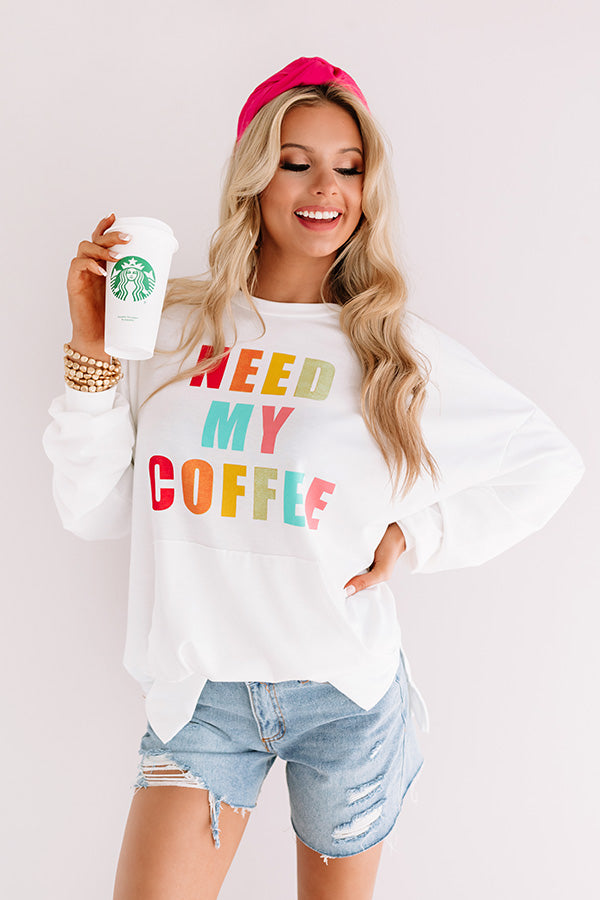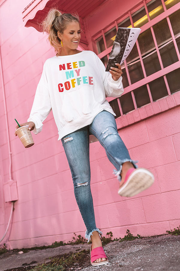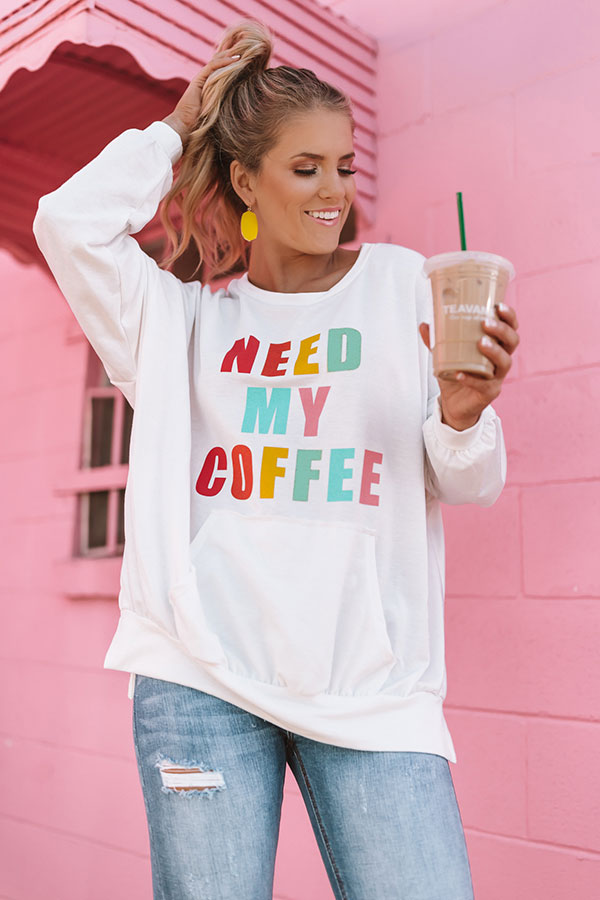 If you are one of those girls who wakes up and says "but first coffee," then this adorable white sweatshirt is PERFECT for you! It features soft lightweight material with colorful block print on the front, a high rounded neckline, long looses sleeves with fitted elastic banded cuffs, a large kangaroo pouch pocket, and a relaxed silhouette that falls into a straight hemline! We have styled this cutie with some distressed ankle skinnies, matching pink sandals, and yellow statement earrings, but you can also wear it with some frayed jean shorts and our "So Relatable Heel in Red!" Measurements