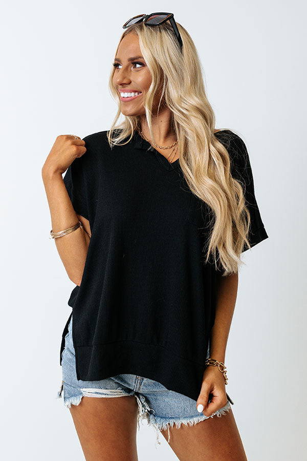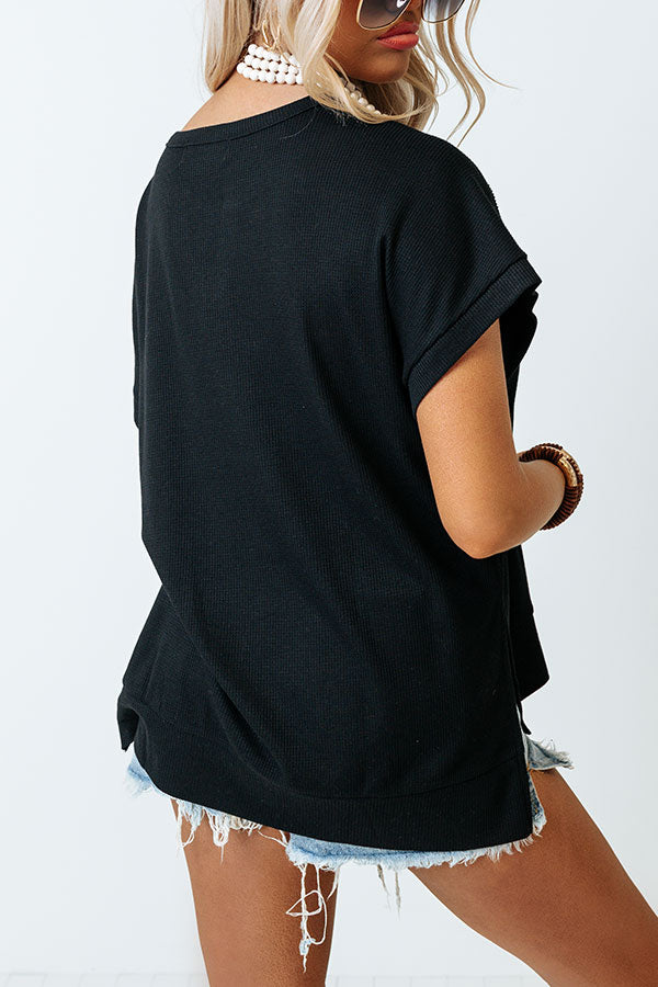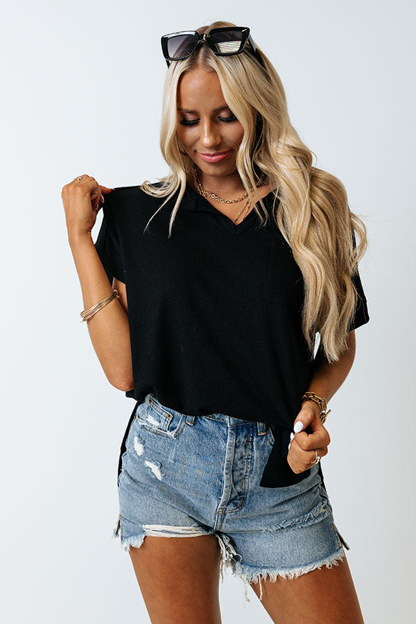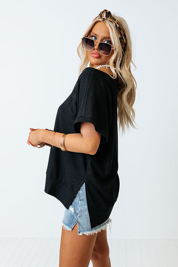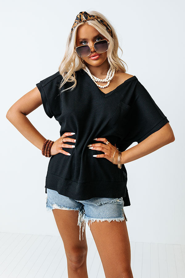 Keep simple but stylish in our basic black 'Neighborhood Hotspot' tee featuring lightweight material with waffle knit texturing, a v-cut neckline, short sleeves, a single accent chest pocket, and a slouched silhouette that ends in a straight hemline with accent side slits! on products