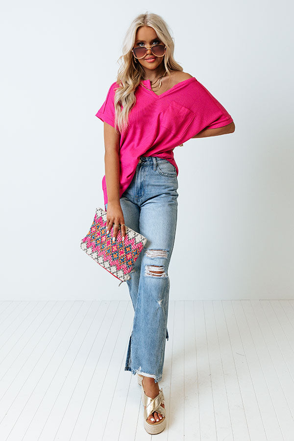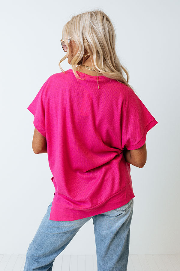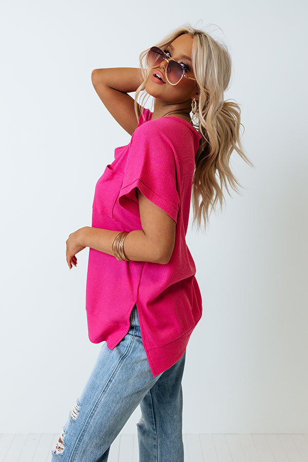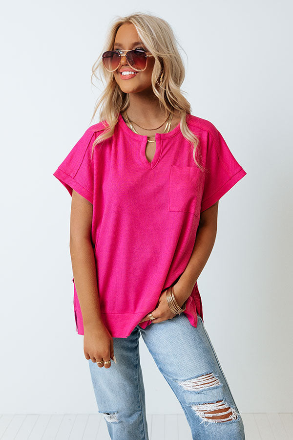Keep simple but stylish in our basic hot pink 'Neighborhood Hotspot' tee featuring lightweight material with waffle knit texturing, a v-cut neckline, short sleeves, a single accent chest pocket, and a slouched silhouette that ends in a straight hemline with accent side slits! on products