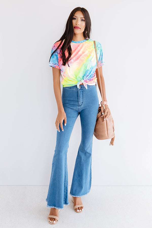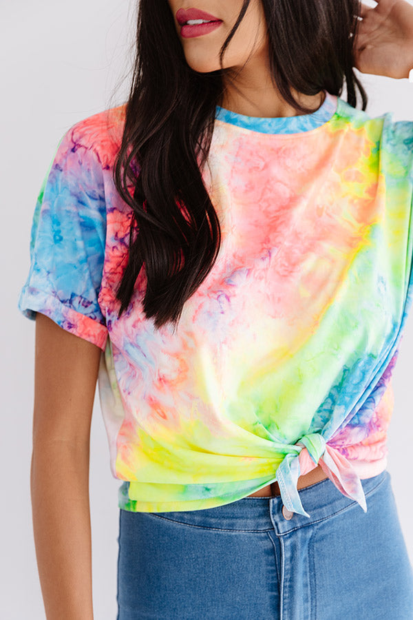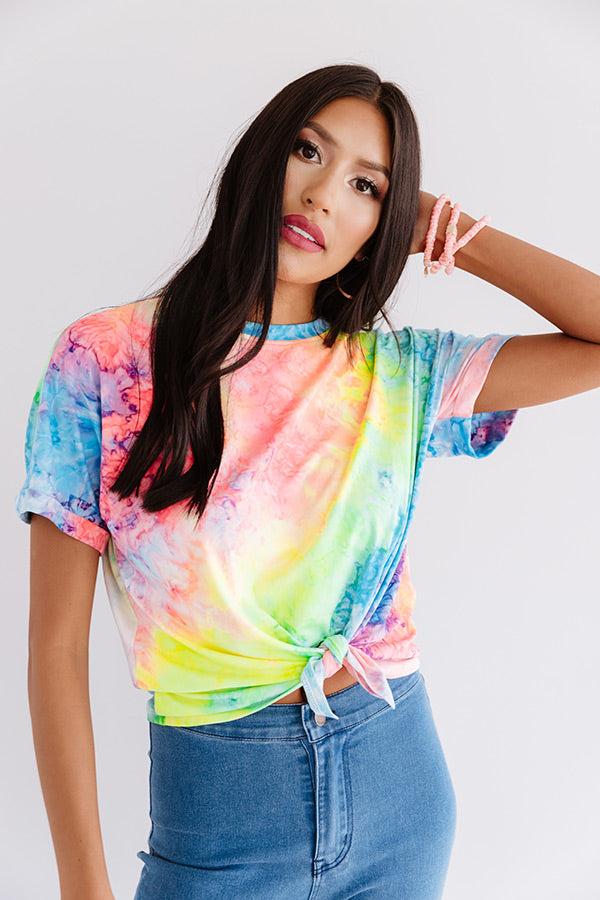 Dance all night under the neon lights in style with this vibrant top featuring soft lightweight material patterned with neon tie dye, a high rounded neckline, short loose sleeves with rolled cuffs, and a relaxed silhouette that falls into a knotted front hemline! We have styled this trendy eye-catcher with some denim flares and a brown mule heel and faux leather bucket bag, but you can also wear it with some distressed white shorts, "The Sunny Sandal in Neon Yellow," and our "Minor Details Tie Dye Headband!"