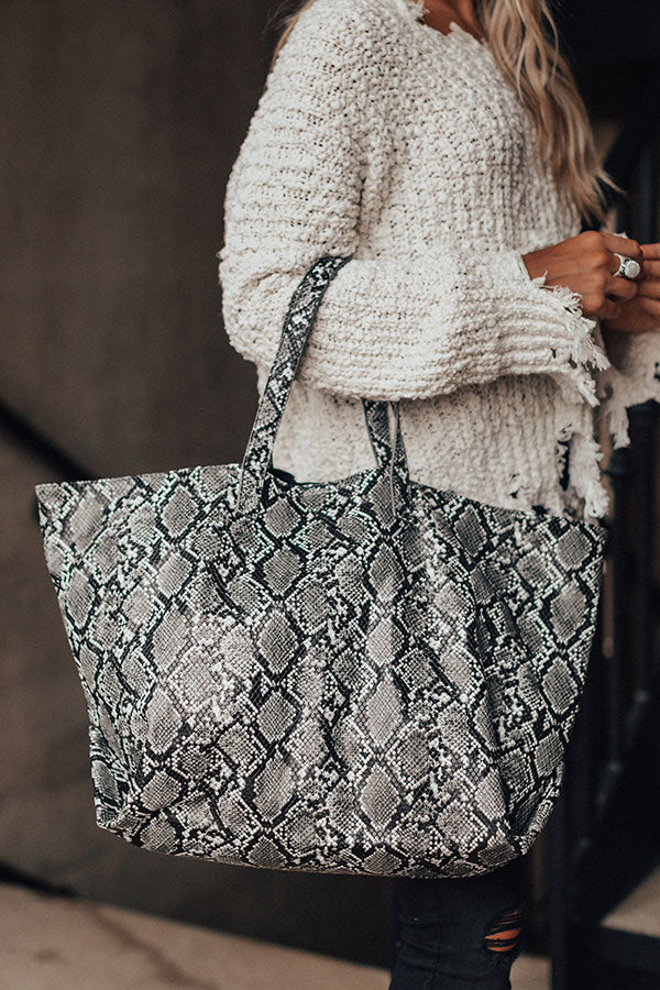 Don't let anybody tell you that you don't need another purse! Treat yourself to our black "Neutral Territory" tote featuring faux leather material, a bold snake print pattern, two handles, and spacious snap button closure!