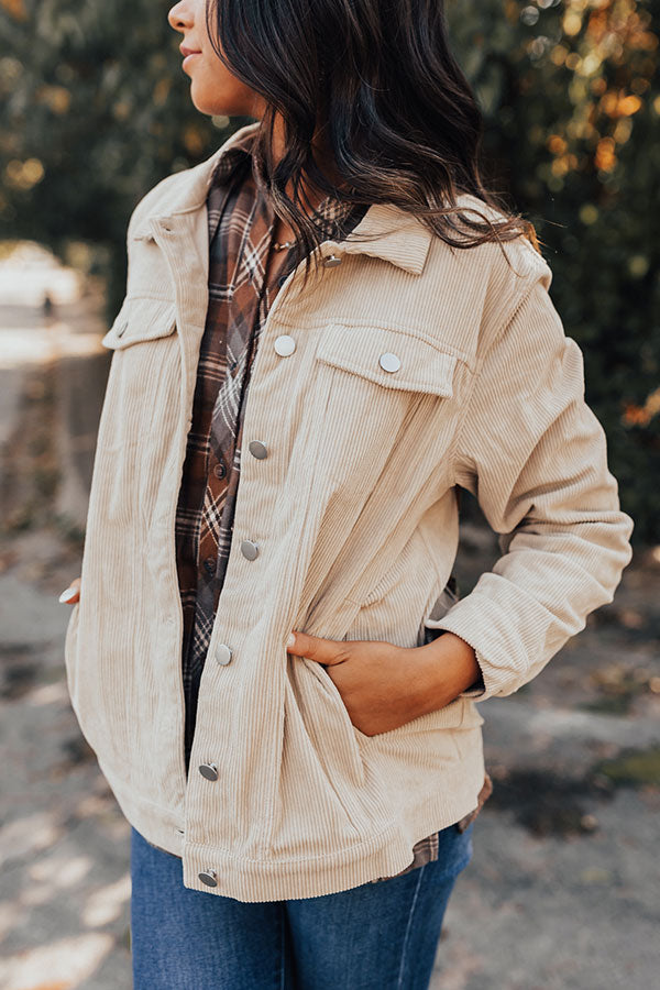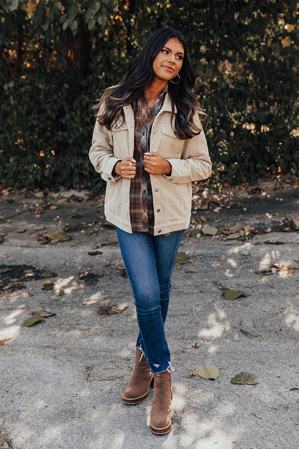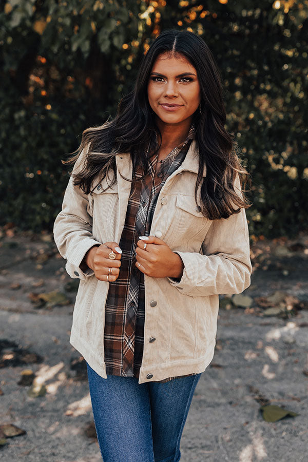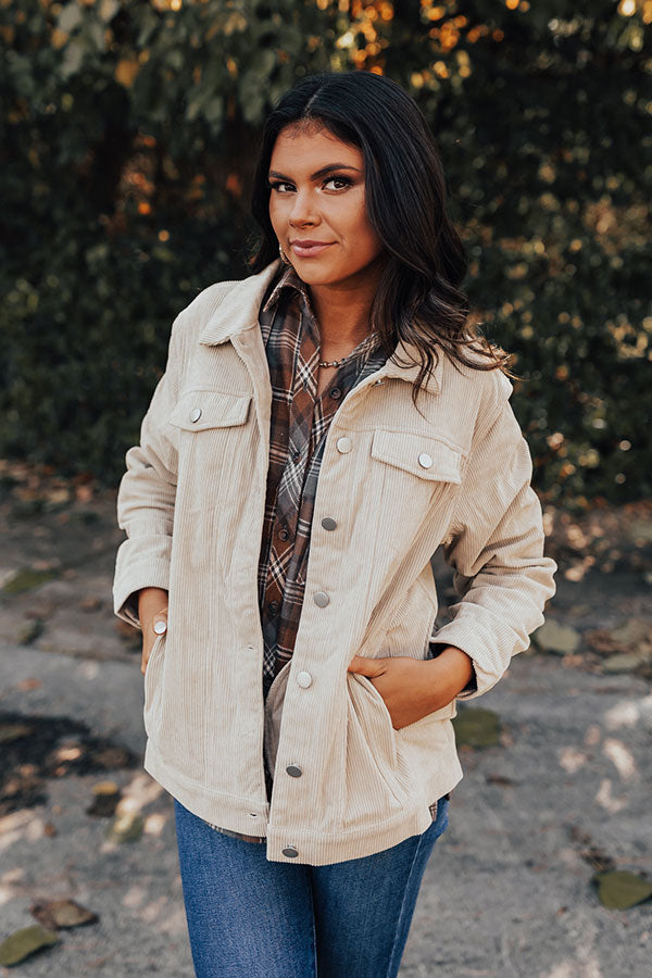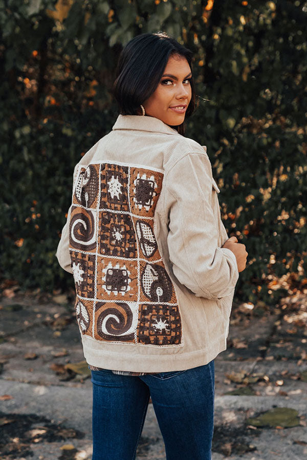 Our 'Never A Worry' corduroy jacket is giving peace, love, and pumpkin spice vibes! Features a lightweight neutral toned corduroy material, collared neckline that goes into a button down front, functional breast pockets with button/flap closure, two functional side pockets, long loose cuff sleeves with buttons, a unique crochet back detail featuring warm brown and ivory tones, and a relaxed silhouette that falls to a straight hemline.