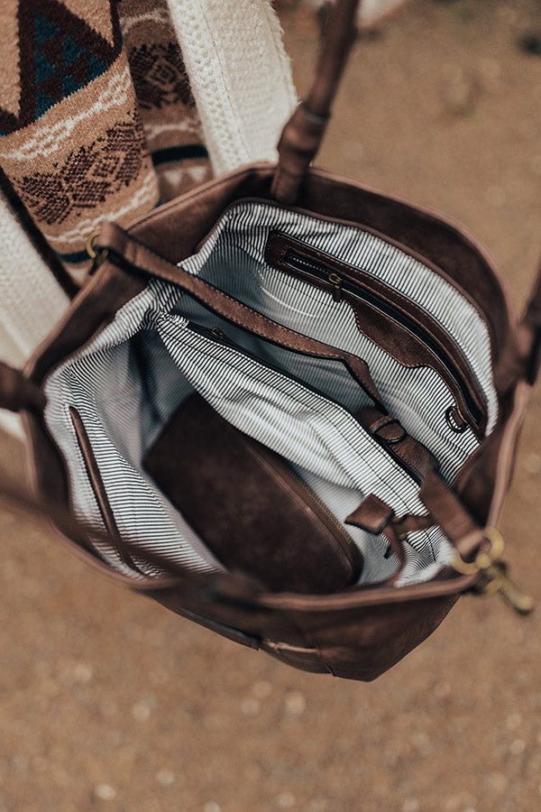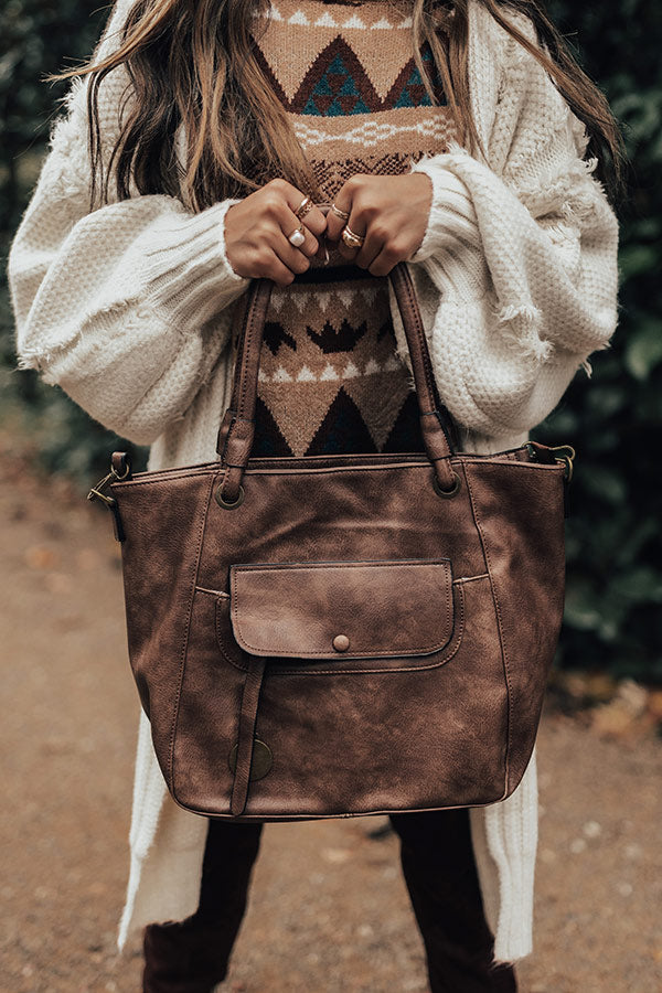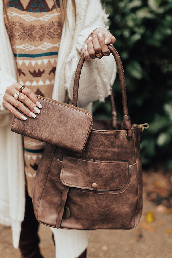 Keep it simple in our chocolate hued 'Never Complicated' tote featuring sleek faux leather material, two tote handles, an outside flap closure pocket, a removable and adjustable shoulder strap, and a spacious fully lined interior with a zip closure and additional inside zip closure pockets! Plus, this cutie includes a matching wallet!