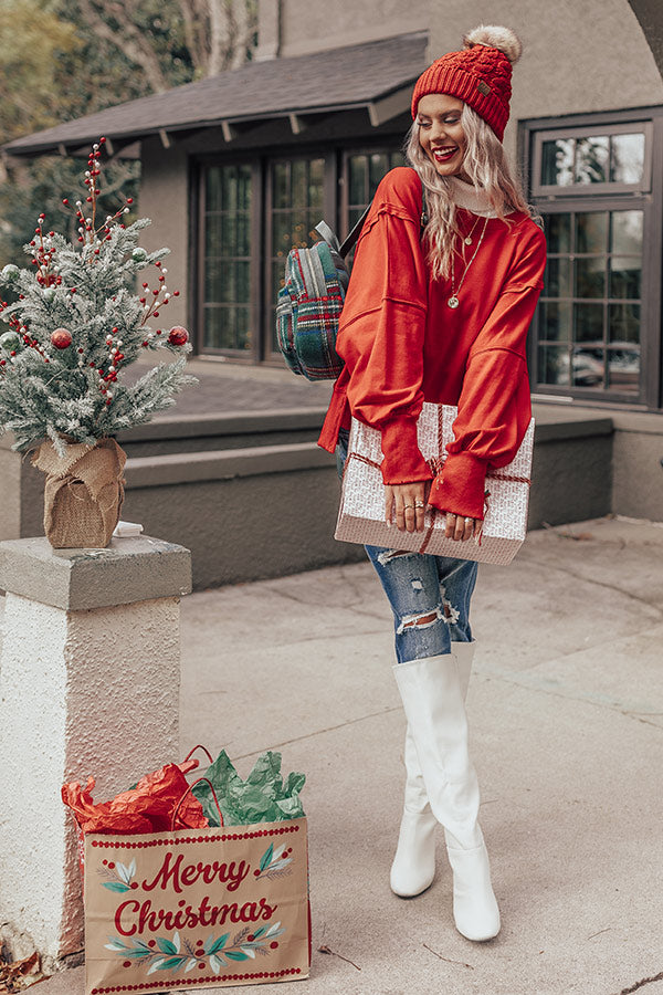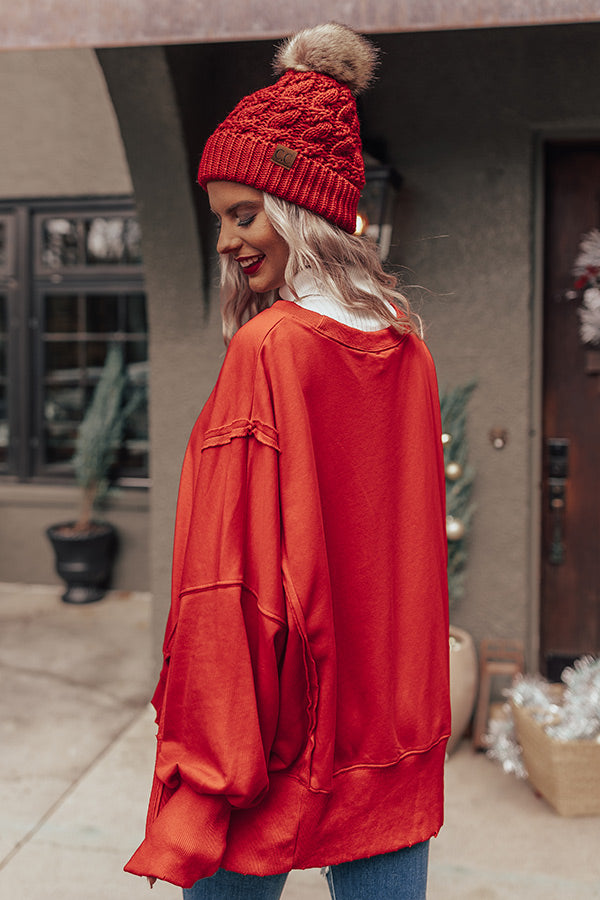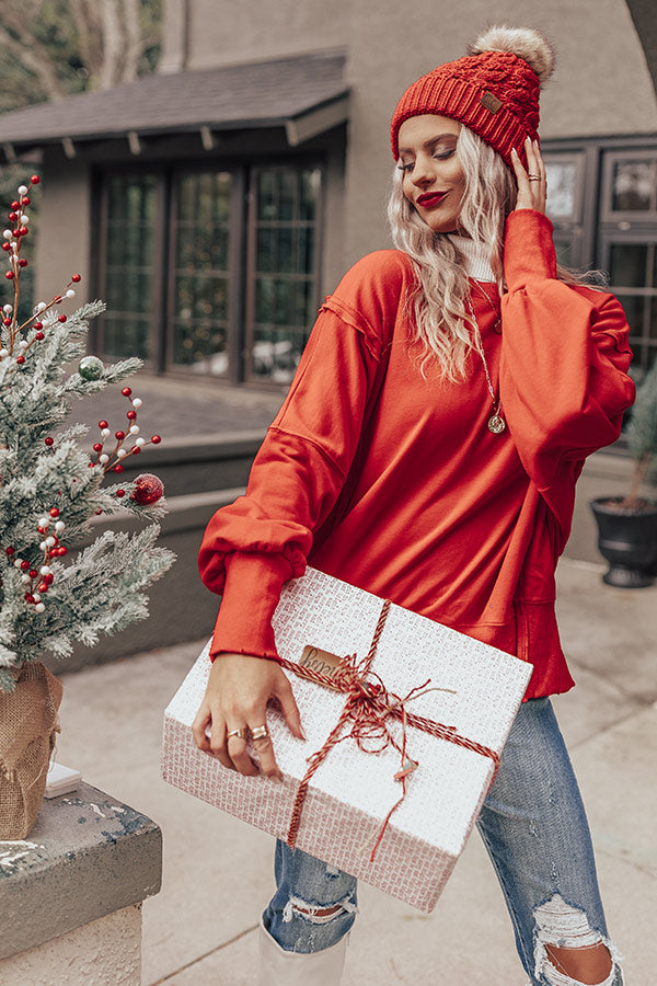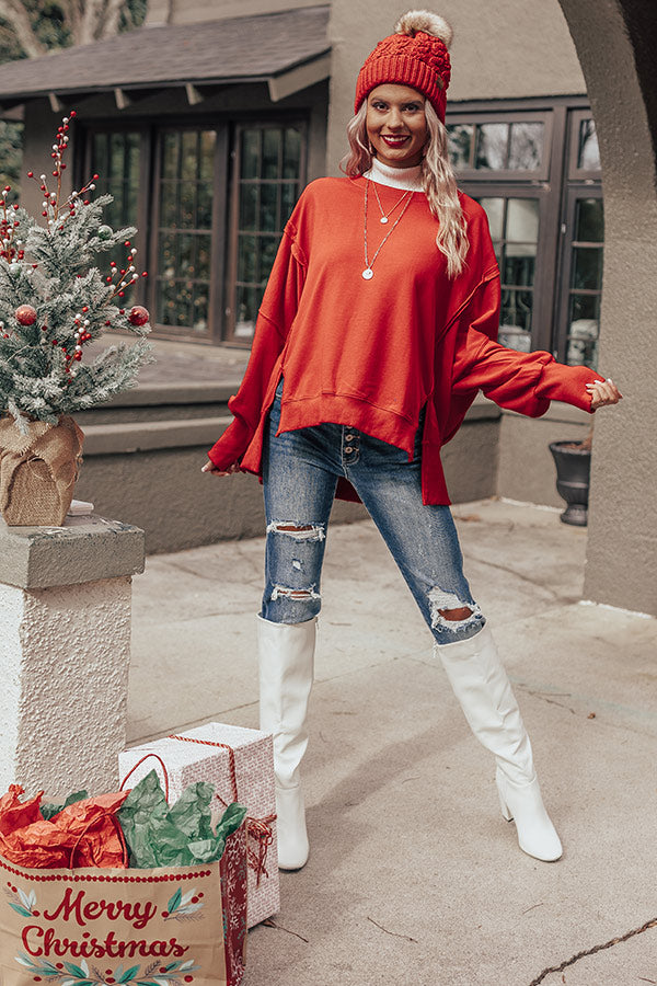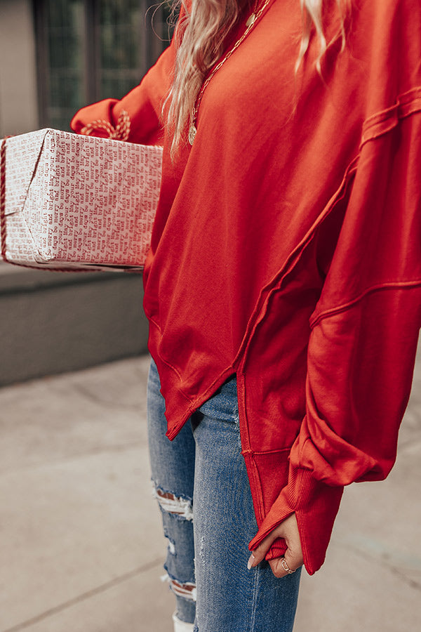 Keep your look simple in our red 'Never Complicated Sweatshirt' featuring soft and comfy material, a rounded neckline, long loose sleeves with fitted forearm cuffs, and a slouched silhouette that ends in a straight high/low hemline with side slits! Measurements