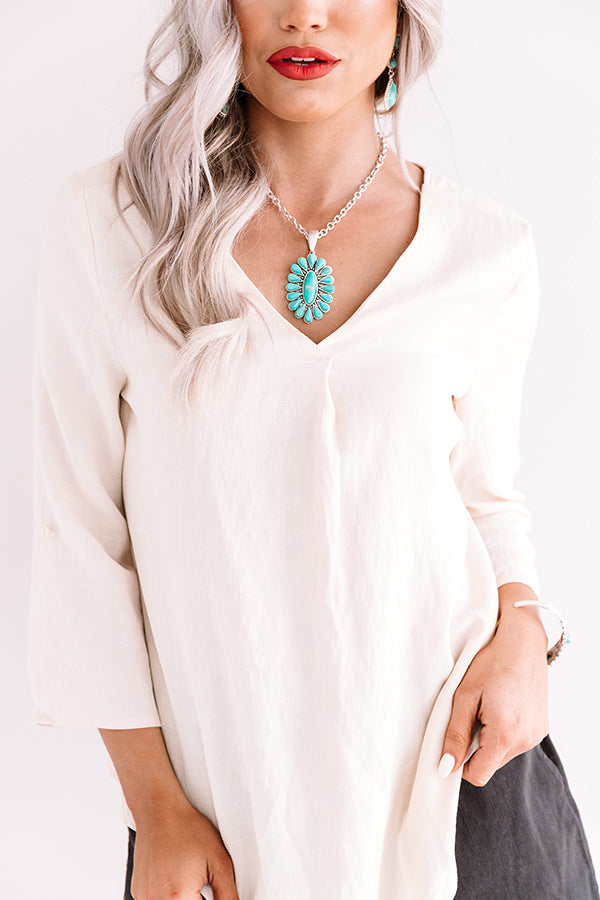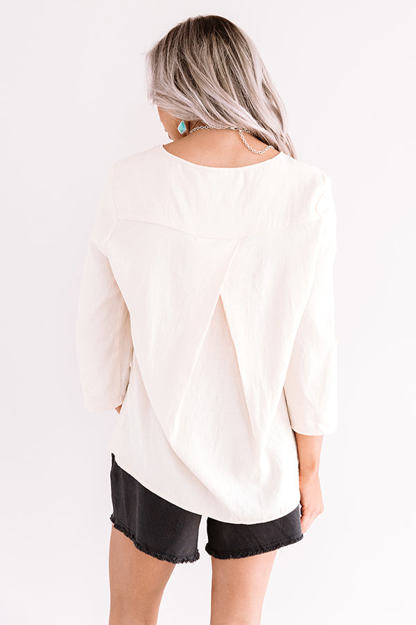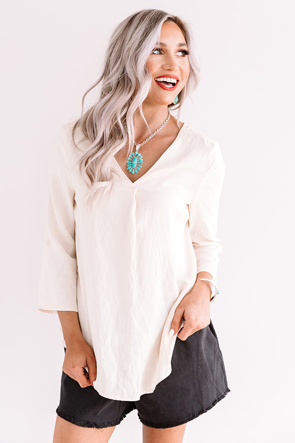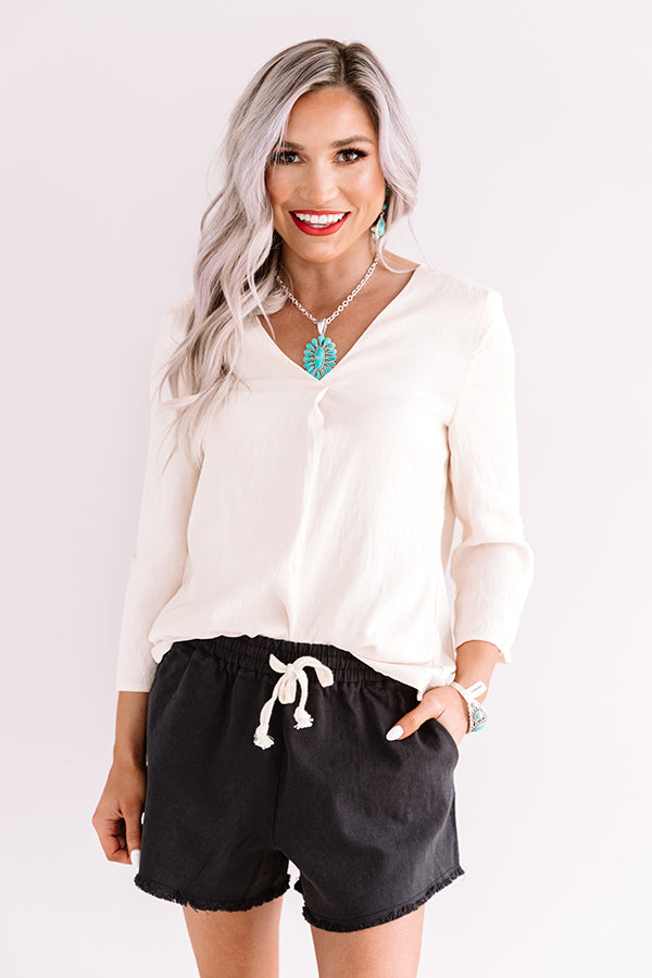 This casual cute cream colored top will never let your OOTD down with its soft lightweight material, v-cut neckline, long loose 3/4-length sleeves, a cute back detail, and a relaxed silhouette that falls into a rounded hemline! This versatile piece styles perfectly with some black shorts, turquoise statement jewelry, neutral wedges, and a woven clutch, but you can also wear it with some distressed ankle skinnies, the "Steve Madden Polaris Slip On Sneaker in Cream," and our "Sunny Days Sunnies in Silver!" Measurements