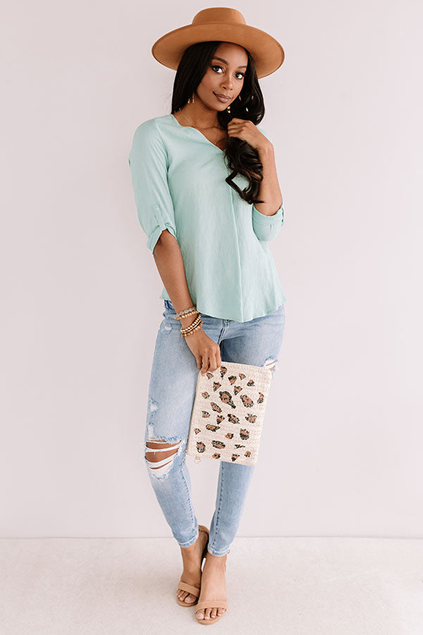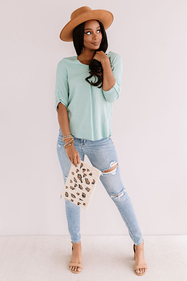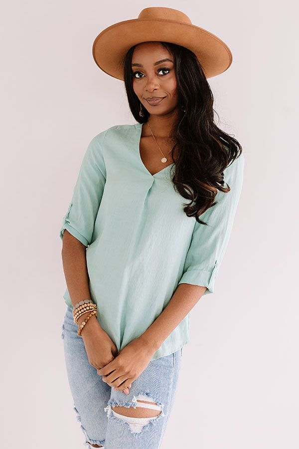 This casual cute mint colored top will never let your OOTD down with its soft lightweight material, v-cut neckline, long loose 3/4-length sleeves with roll-tab cuffs, a cute back detail, and a relaxed silhouette that falls into a rounded hemline!