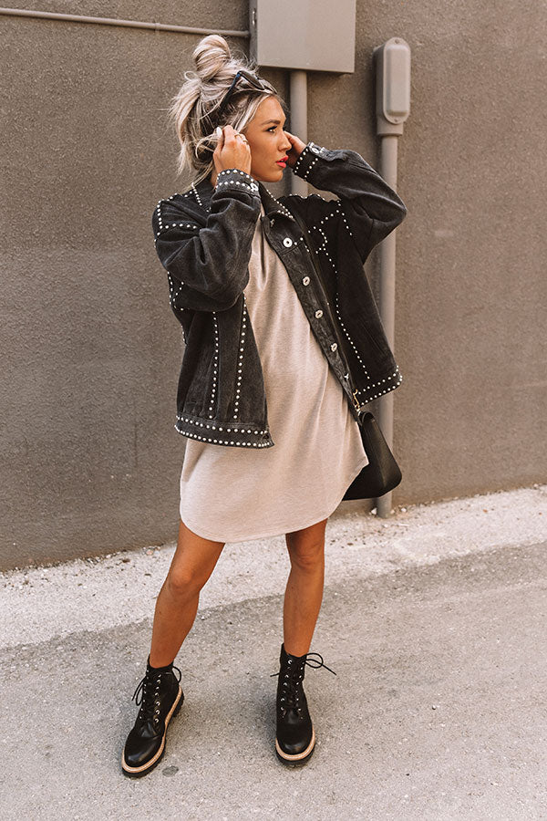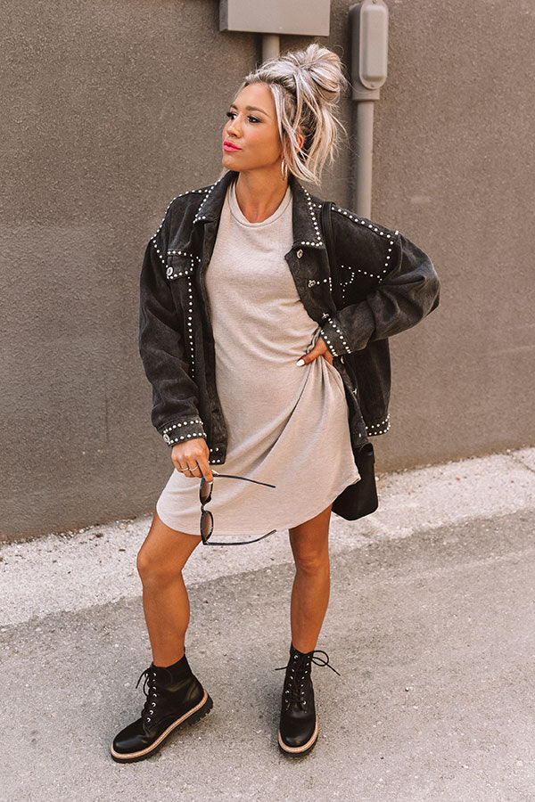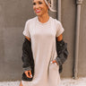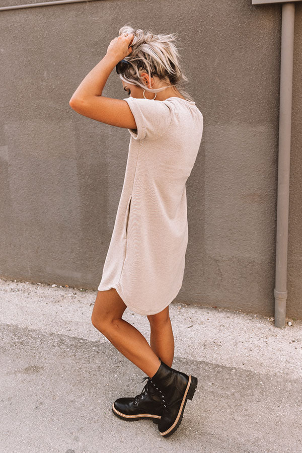 When your are planning a new adventure be sure to bring along this trendy taupe colored t-shirt dress featuring soft lightweight material, side pockets, a rounded neckline, rolled short sleeves, and a straight fit silhouette that falls into a rounded hemline! Measurements