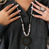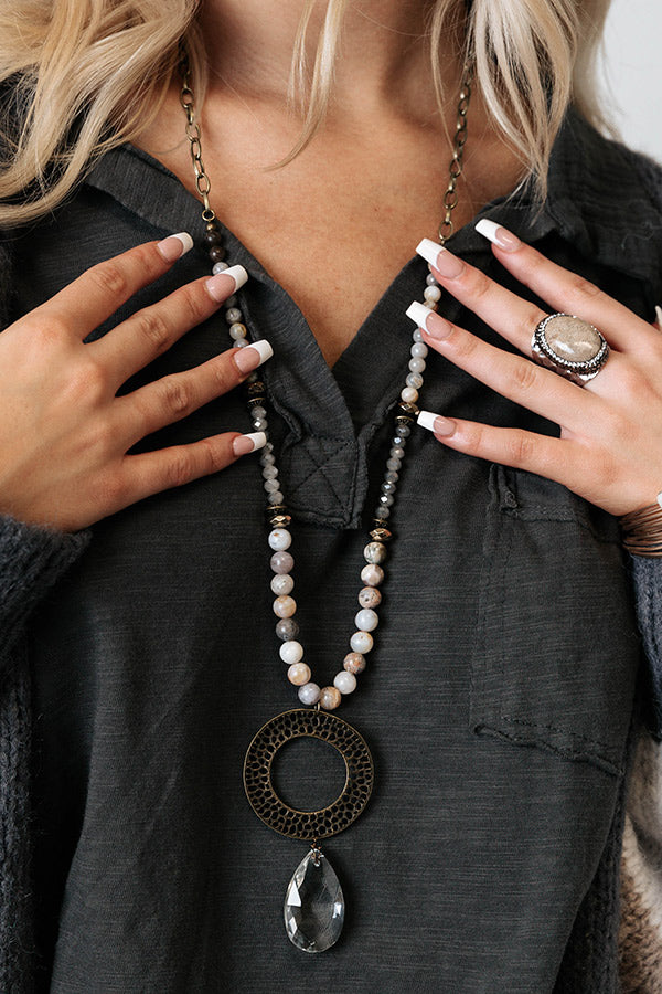 Be bold in our gorgeous 'New Agenda' necklace featuring a long natural hued beaded chain with a large black hoop pendant and teardrop rhinestone!