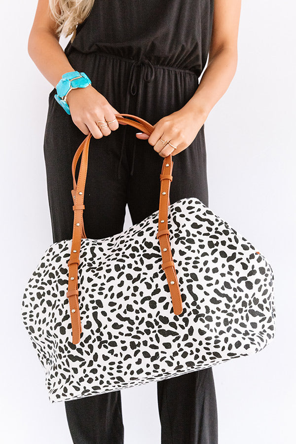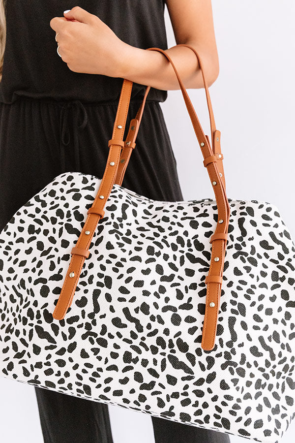 This adorable ivory colored tote is sure to be your "new crush" with its lightweight canvas material, bold black leopard print, two faux leather straps, and a spacious pouch with a zip closure and additional inside pockets!