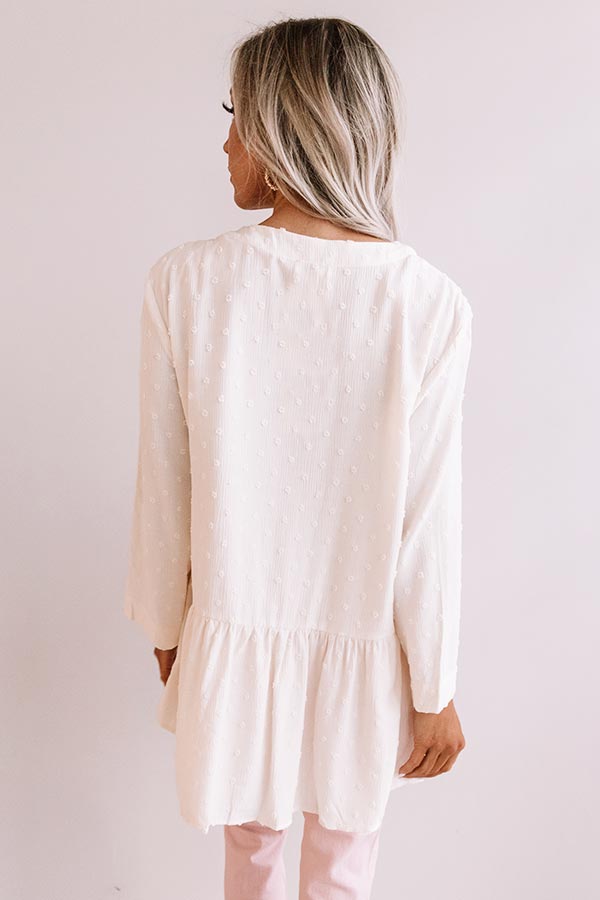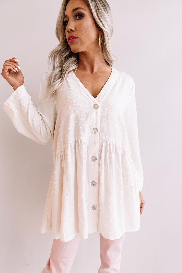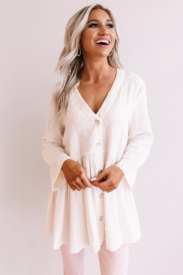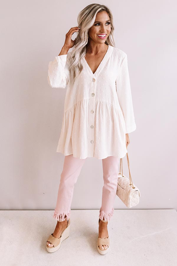 You will not look like the "new girl in town" when you wear this charming cream colored top featuring lightweight material patterned with polka dot texturing, a button up bodice with a deep v-cut neckline, loose 3/4-length sleeves, and a relaxed babydoll silhouette that falls into an uneven tunic length hemline! We have styled this cutie with some pink frayed ankle skinnies, sunnies, a chic crossbody, and neutral wedges, but you can also wear it with some distressed denim shorts, "The Saylie Peep Toe Heel in Blush," and our "Pass The Prosecco Wool Hat in Blush!" Measurements