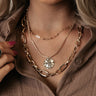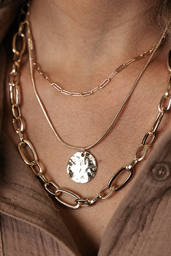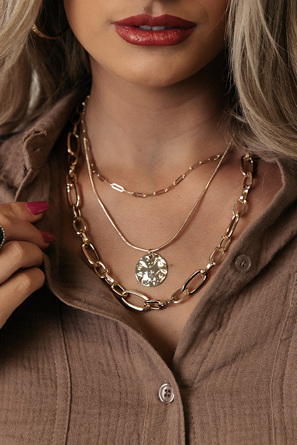 No outfit is complete without jewelry, so don't hesitate to add our luxe 'New Haven Necklace' to your cart with its three layered pieces: a dainty chain link choker, a medium length pipe chain with a stamped gold pendant, and a longer larger link chain!