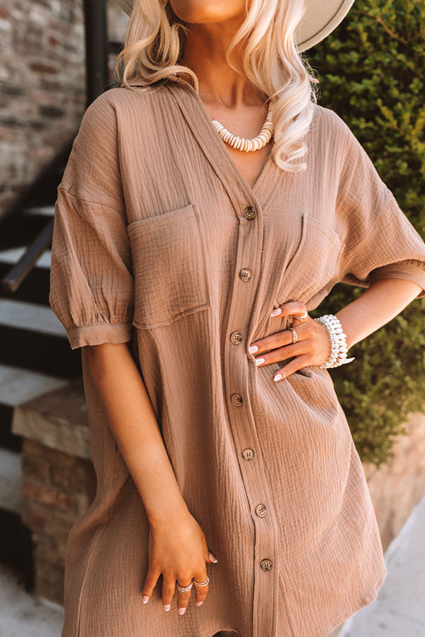 There is no better way to look cute but casual than in our simple taupe hued 'New In Town Shift Dress' featuring lightweight textured material, a button down front with a collared neckline, loose half sleeves, two accent chest pockets, hidden side pockets, and a relaxed silhouette that falls into a straight mid-thigh length hemline!