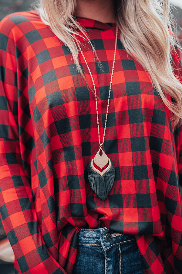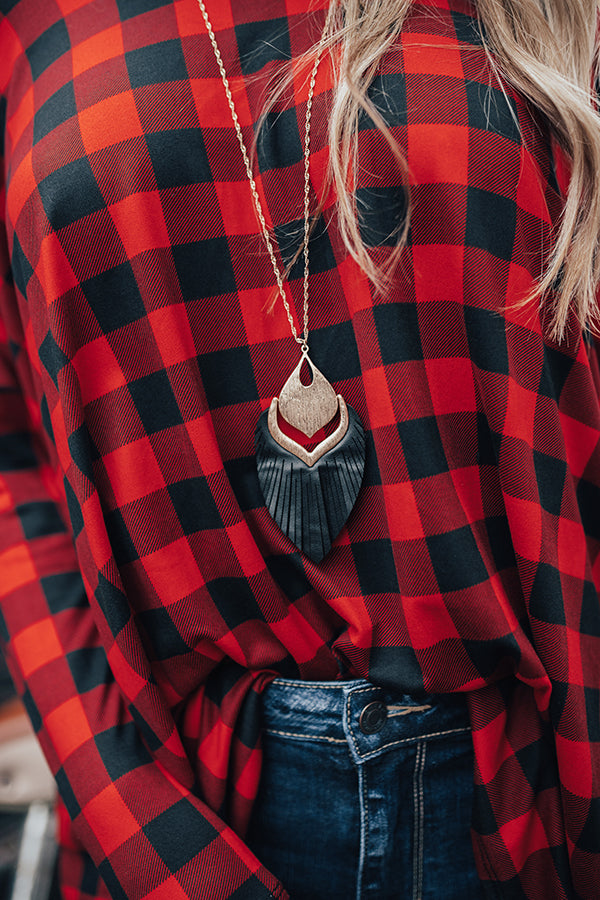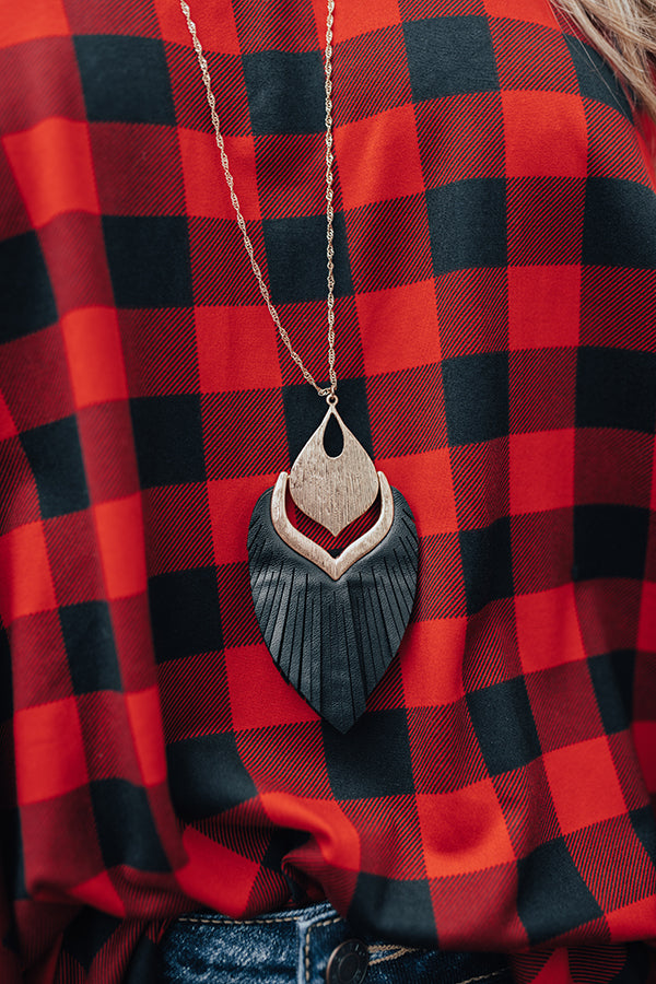Make a stylish statement with our dainty "New Love" necklace featuring a long gold chain with a black faux leather pointed fringe pendant!
