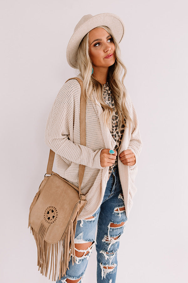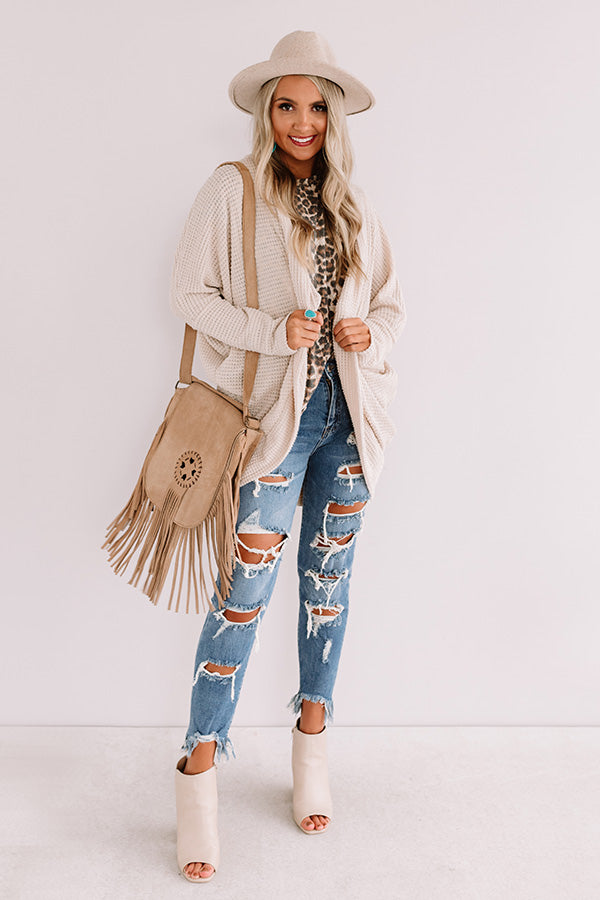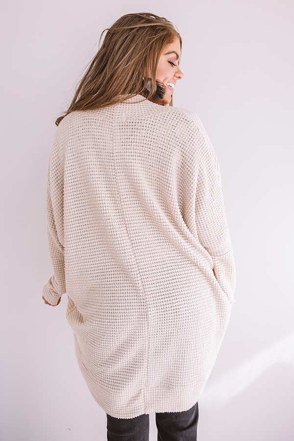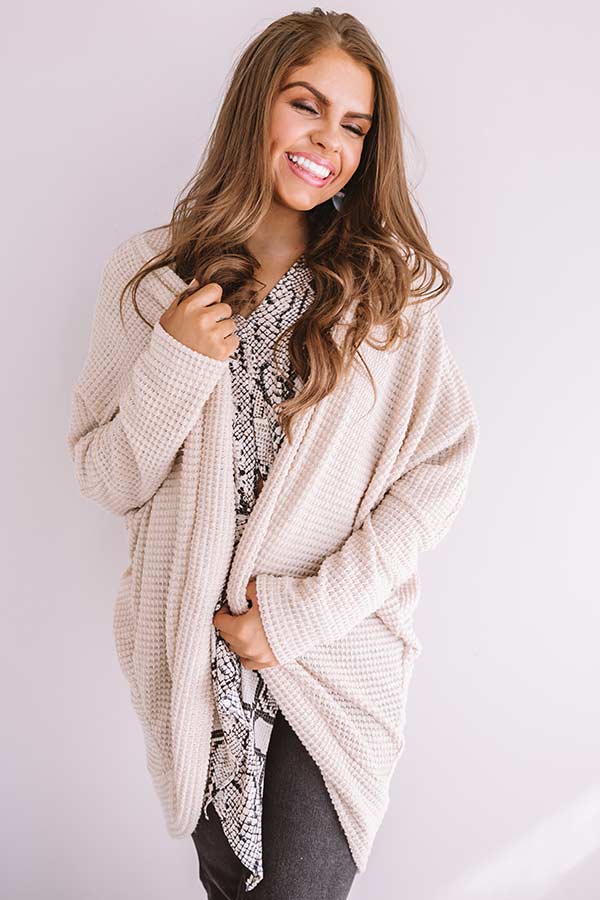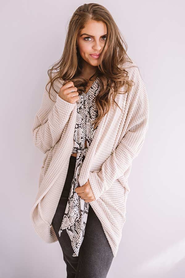 This adorable birch colored cardigan is sure to be your "new love" with its soft lightweight material featuring waffle knit texturing, long loose sleeves, and an ultra draped open front silhouette that falls into a rounded uneven mid-thigh length hemline! You can wear this versatile piece with just about anything from a basic tank to a sweater, jeans to skirts or dresses, booties to wedges or sandals, clutches to totes, and hats to earrings! Measurements
