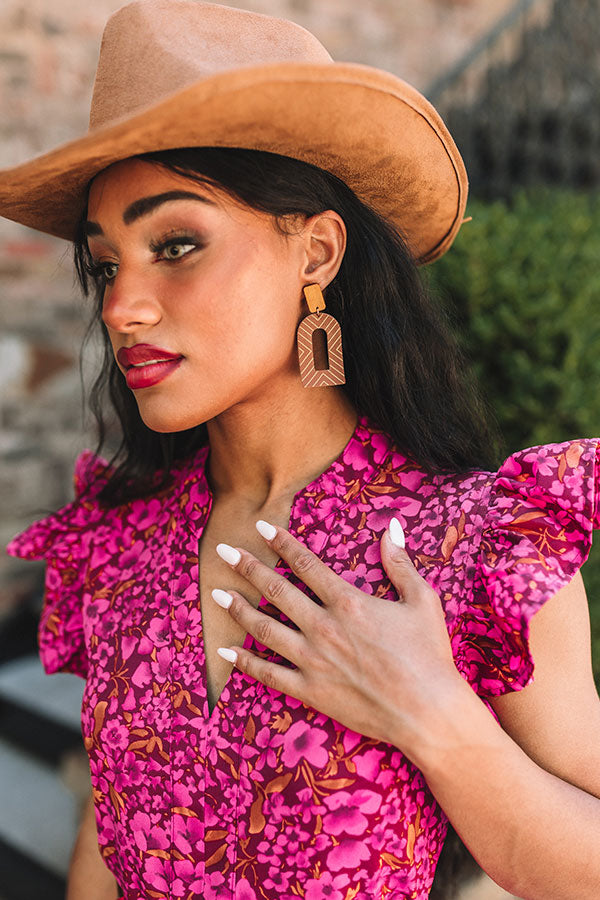 Add a unique piece to your jewelry collection with our beautiful 'New Path' earrings wooden rectangle studs and dangling brown closed faux leather horseshoes with an open center and zigzag stripe detailing!