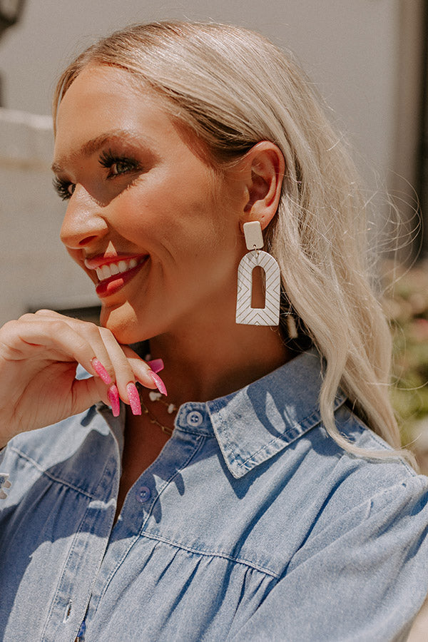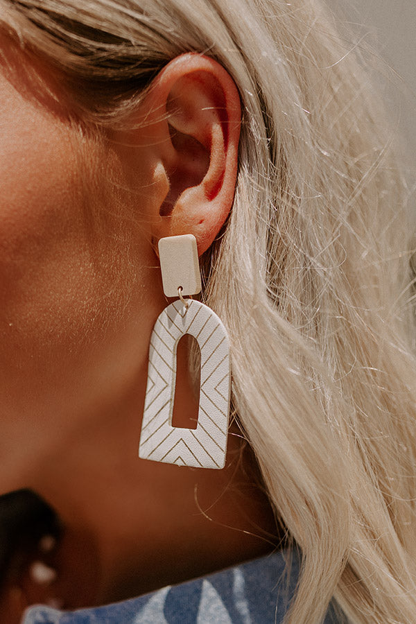 Add a unique piece to your jewelry collection with our beautiful 'New Path' earrings wooden rectangle studs and dangling ivory closed faux leather horseshoes with an open center and zigzag stripe detailing!