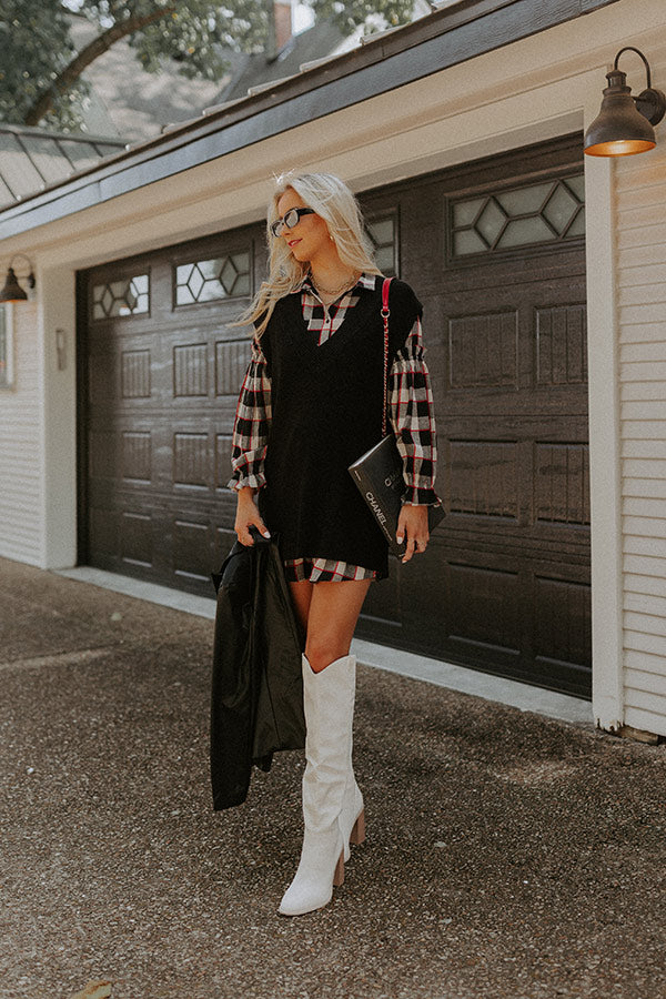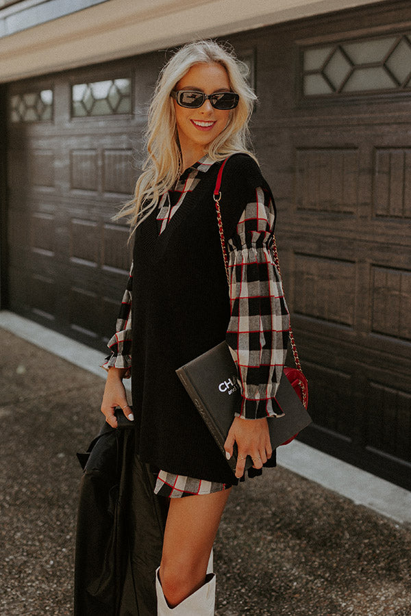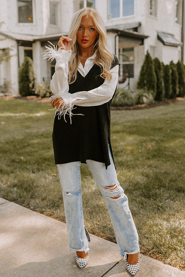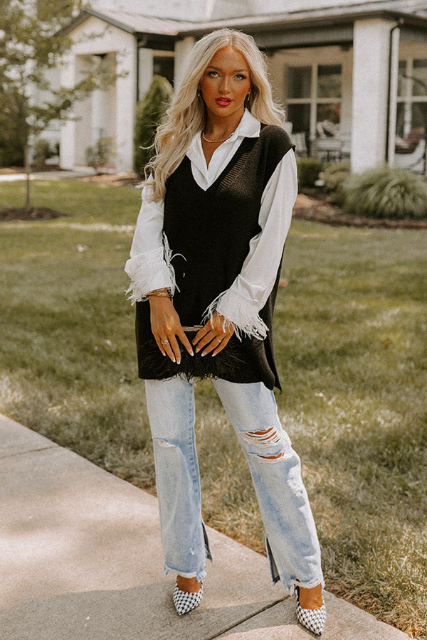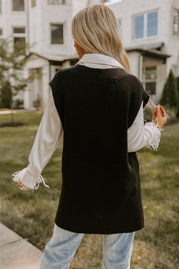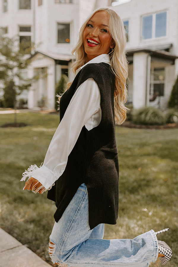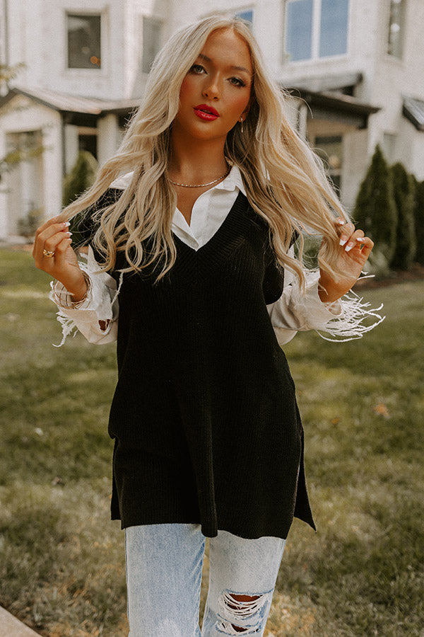 The perfect fall layering piece, our black 'New Trails' top features soft knit material, a v-cut neckline, wide sleeveless shoulder straps, and a relaxed vest-like silhouette that ends in a straight tunic-length hemline!