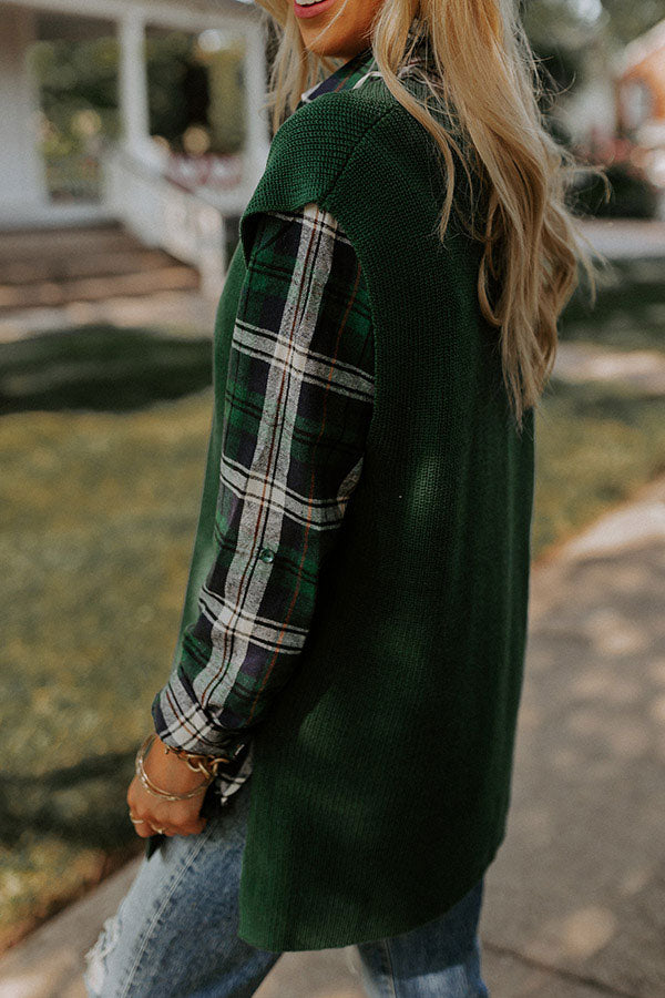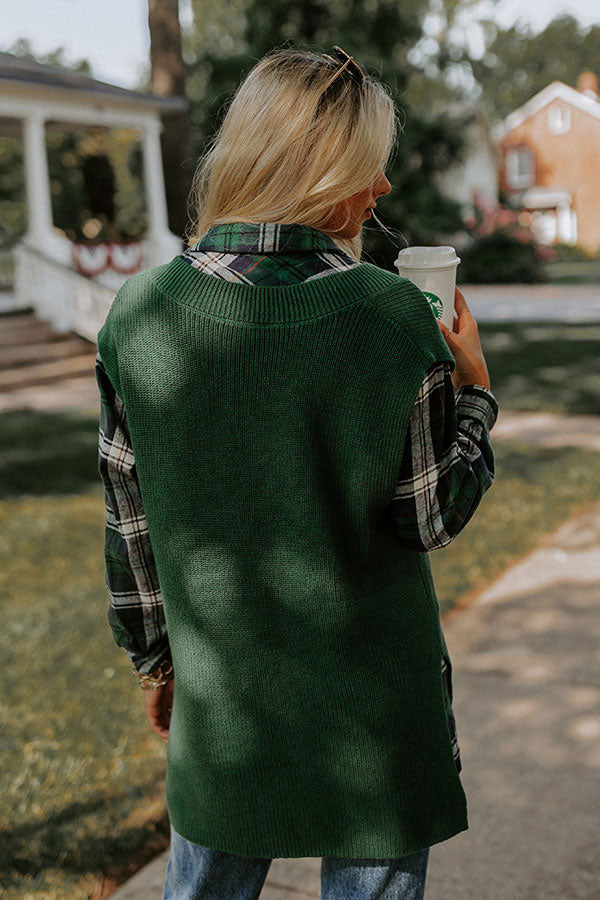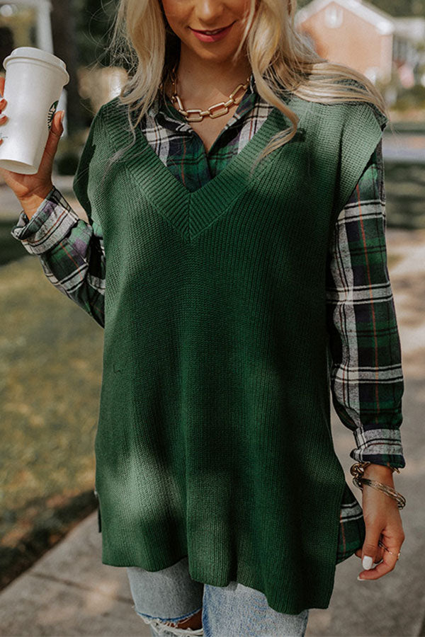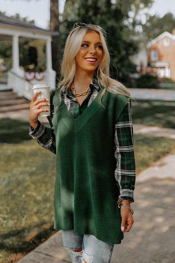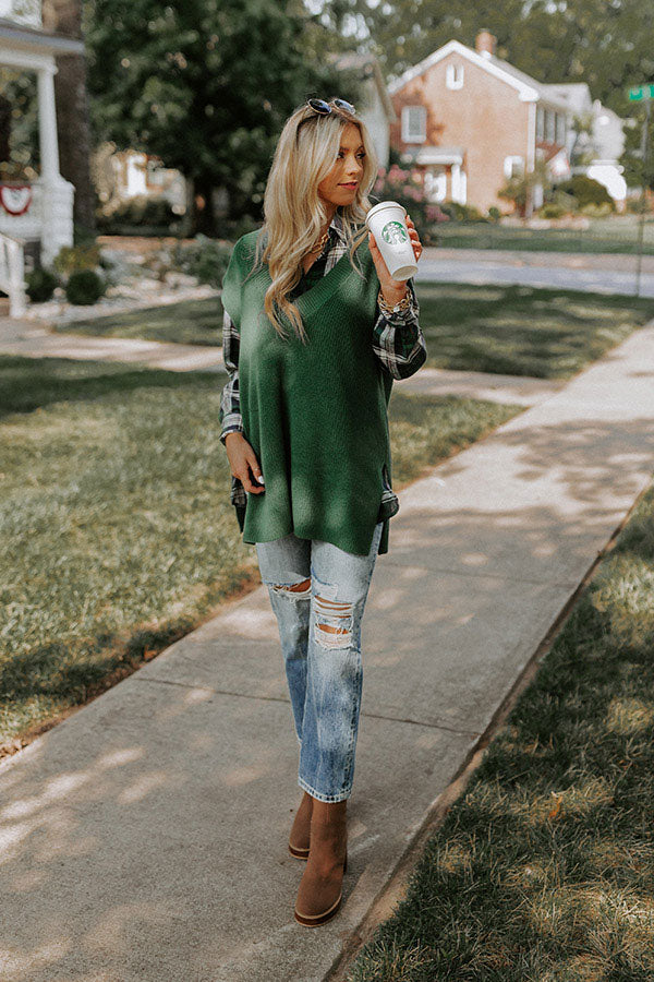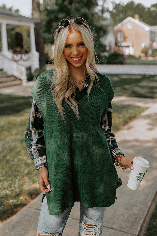 The perfect fall layering piece, our hunter green 'New Trails' top features soft knit material, a v-cut neckline, wide sleeveless shoulder straps, and a relaxed vest-like silhouette that ends in a straight tunic-length hemline!