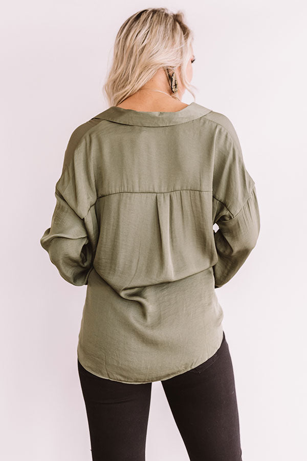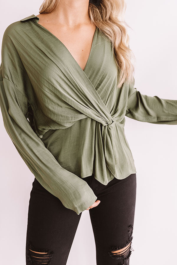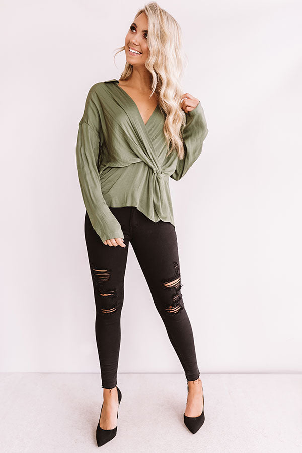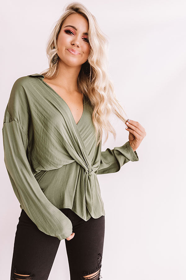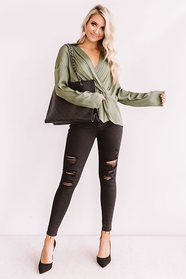 You will look like you walked straight out of "New York fashion week" when you wear this chic and elegant top featuring lightweight olive toned satin material, a v-cut neckline, long loose sleeves, and a relaxed wrapped front bodice that falls into a peplum bottom with an uneven hemline! This flirty transitional piece styles perfectly with some distressed black skinnies, pumps, statement earrings, and a tote, or you can wear it with some denim flares, "The Lyra Snake Print Heel," and our "Plans In Paris Wool Hat in Taupe!" Measurements