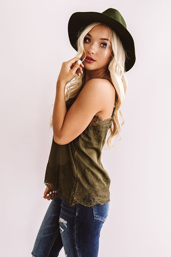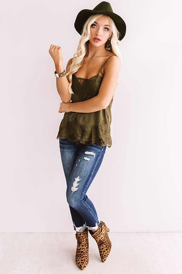 Own those "New York nights" in this chic olive colored camisole featuring lightweight satin material, lace trim detailing, a scooped neckline, adjustable spaghetti straps with a low back, and a relaxed bodice that falls into an uneven hemline! This flirty year round basic can be styled a variety of ways, like with some distressed ankle skinnies, a matching faux suede hat, and leopard booties, or it can be worn tucked into our "Weekend In NYC Ribbed Velour Skirt in Ecru Olive" and layered under our "Simply Swept Away Ribbed Cardigan in Birch" and accessorized with taupe pieces like our "Seraphina Faux Leather Wedge" and "Delicate Details Faux Leather Clutch!"
