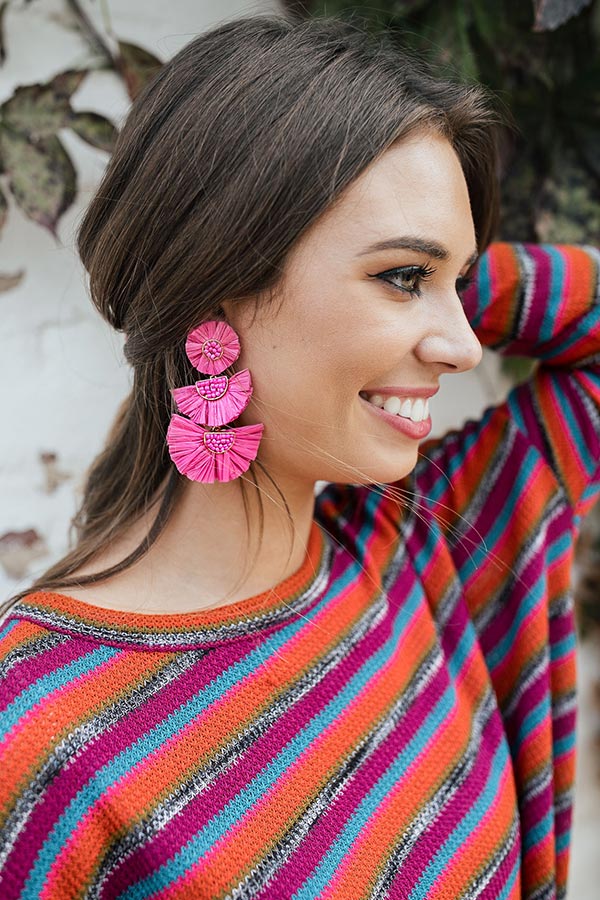 Slay all day by accessorizing with our stunning hot pink "Paris Lights" statement earrings featuring beaded circle studs and dangling half circle centers surrounded by paper fringe!