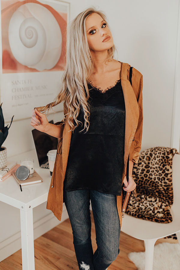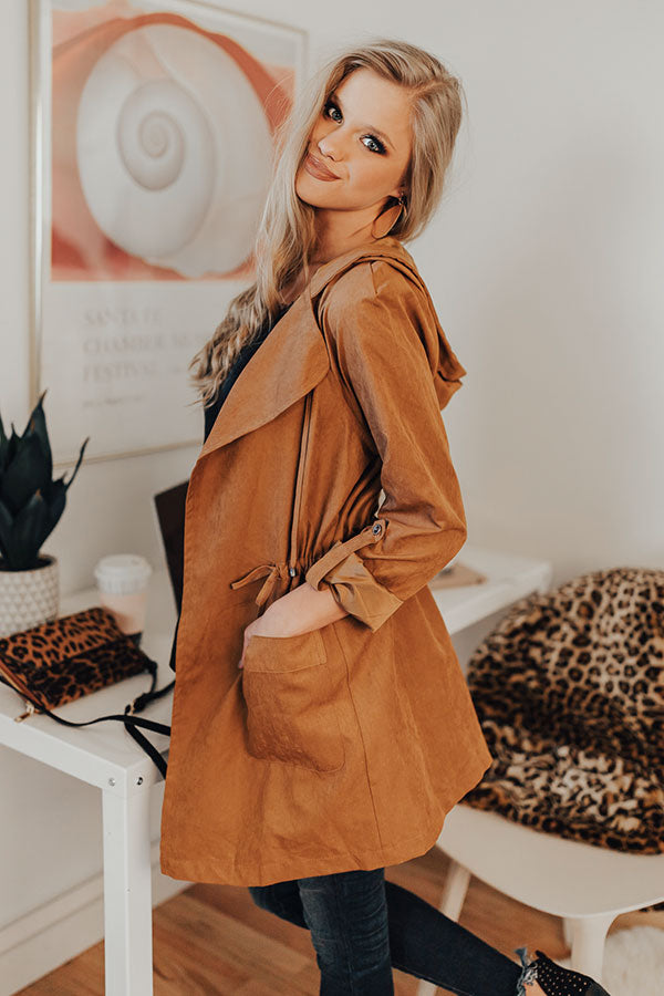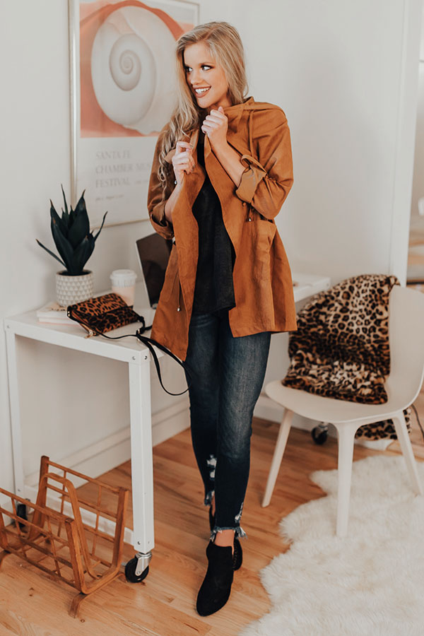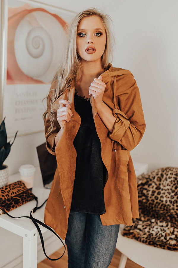 Crisp Fall mornings call for coffee & cute jackets! The "Latte All Day" lightweight hooded jacket has long roll-tab sleeves, an adjustable drawstring waistline (that allows you to create the perfect fit for you) & a relaxed open-front silhouette with a great suede-like feel & front pockets. Layer this jacket over any of your favorite basics to add a little warmth & style to any look.