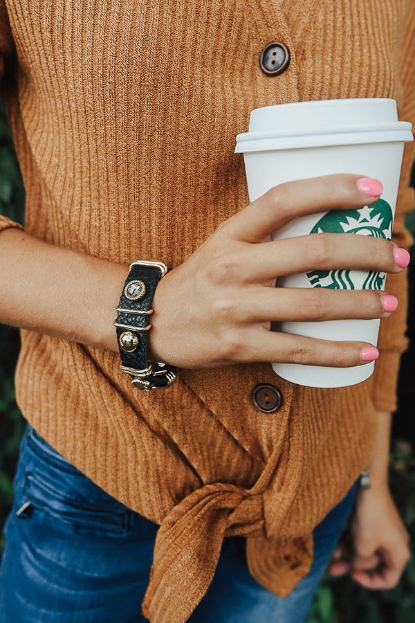 Oh snap! We have never seen a bracelet this cute! It features gold metal band and faux diamond accents set inside a black faux leather band with a two button snap closure!