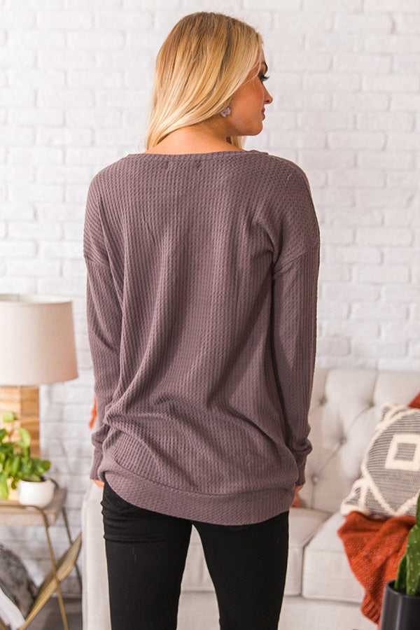 Keep your look cute and cozy with the "Cozy in Denver Shift Top!" This ultra soft espresso waffle knit shift top has a strappy v-cut neckline, long sleeves, and a relaxed shift style bodice. Wear this soft and stylish shift top with your favorite denim, or under any of your favorite cardigans or jackets, to create a variety of "casual cute" looks that you will wear time and time again!
