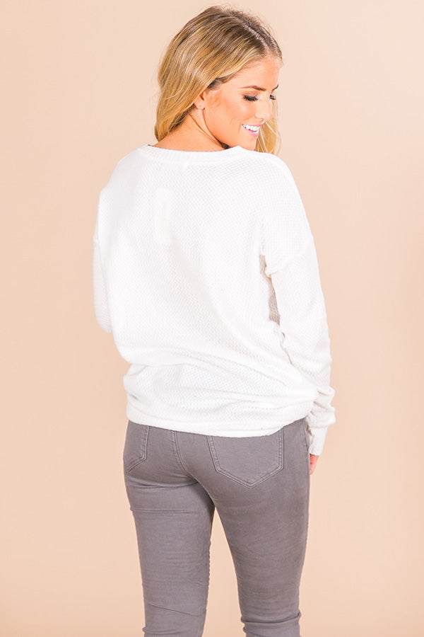 Keep your look cute and cozy with the "Cozy in Denver Shift Top!" This ultra soft white waffle knit shift top has a strappy v-cut neckline, long sleeves, and a relaxed shift style bodice. Wear this soft and stylish shift top with your favorite denim, or under any of your favorite cardigans or jackets, to create a variety of "casual cute" looks that you will wear time and time again!