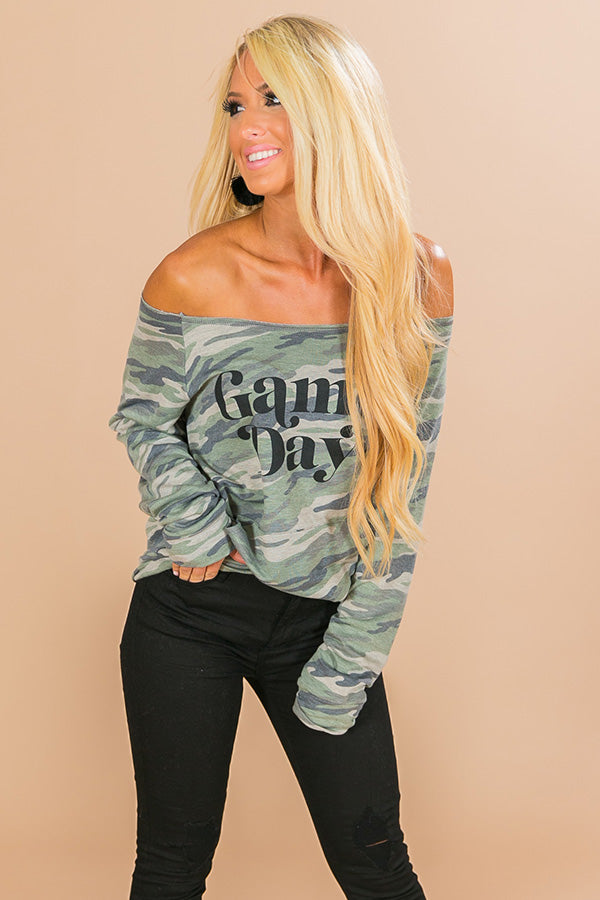 Hip hip hooray, it's almost game day! This camo sweatshirt is sure to keep you warm on those chilly game days with its rounded neckline that can be worn off one shoulder, cute "game day" lettering, front pouch pocket, and loose cozy fit with a fitted hem! This piece styles perfectly with some black skinnu jeans and black booties, or you can pair it with some frayed denim shorts, "The Tipton Espadrille in White," and our "Sugar Crush Earrings in White!" Measurements