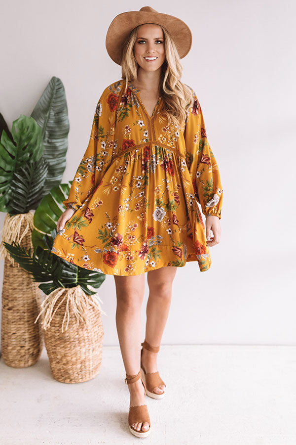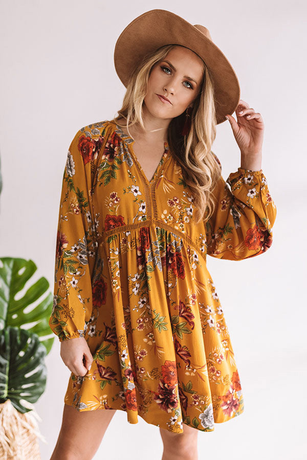 There is no better way to transition into your harvest wardrobe than in a dress that is as colorful as the season! This mustard shift dress features a fall floral pattern, eyelet pierced v-neckline, an empire cut waist, long blousy sleeves with elastic cuffs, a mid thigh length hem, and a breezy shift silhouette that you are sure to adore! Keep your look chic with a block heel, crossbody, and headband, or add a little warmth to your look with a great pair of over-the-knee boots, a tote, and a faux suede hat! Measurements