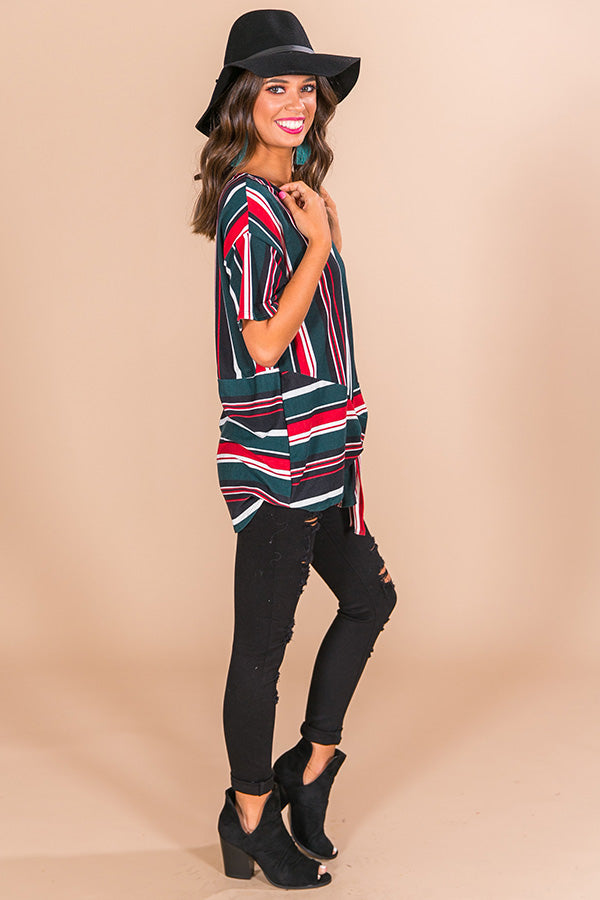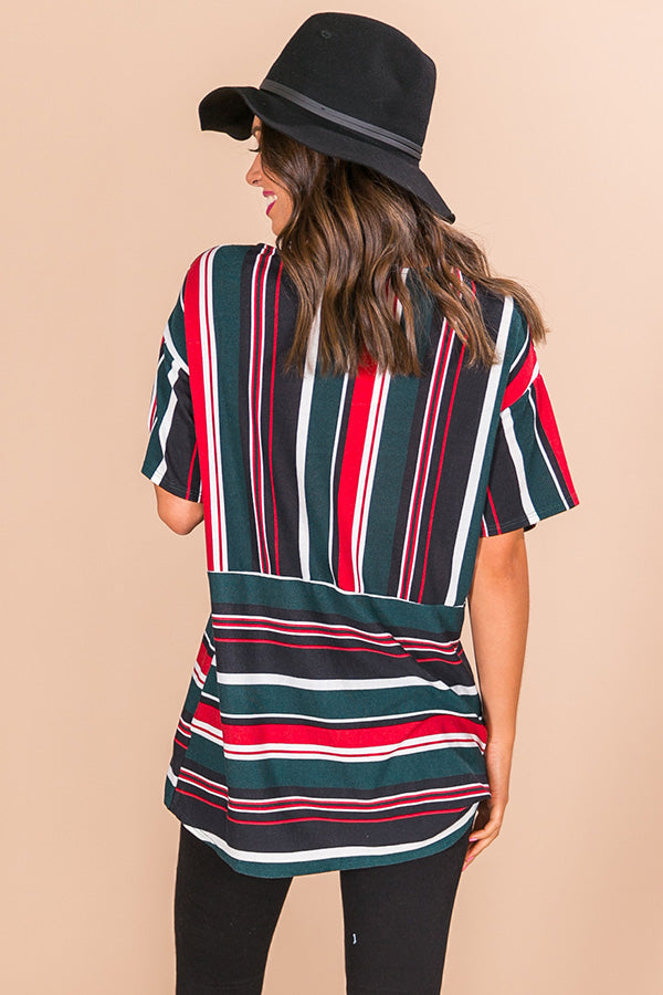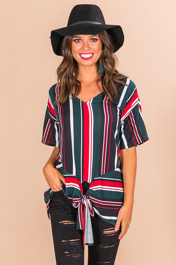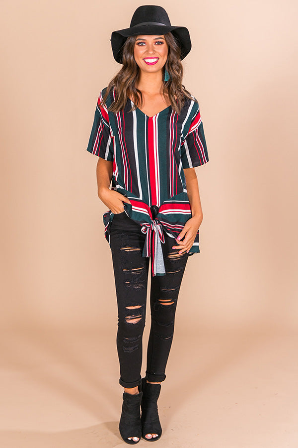 Create a fabulous festival worthy outfit on the fly with a great felt hat, distressed denim & this stylish striped tie top! The "Cannes For The Weekend Shift Top" has a v-cut neckline, short sleeves, a relaxed striped woven polyester bodice & a tie-front hem. The only thing missing from this look is a few fun girlfriends & some great music!