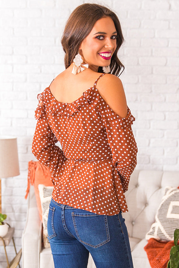 Wrap up the work week with a posh & polished top that's DOT it going on! This polka dot wrap top has thin spaghetti straps that support a long petite belled sleeve with ruffled open shoulders, & a ruffled surplice bodice that wraps & ties at the waist. Keep your look sweet & sophisticated with dark denim skinnies & a nude heel or pump, or add a little retro flair to your look with a great pair of flares!