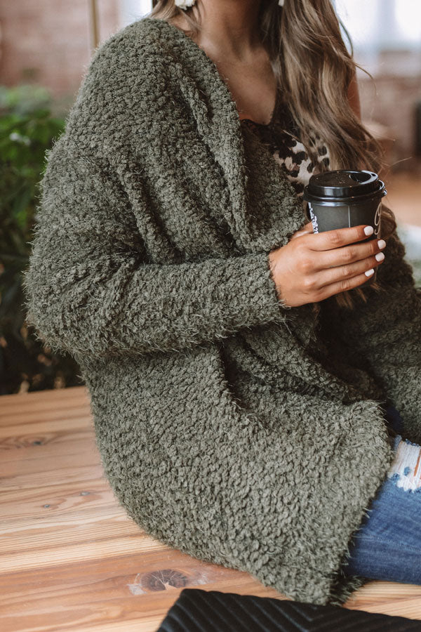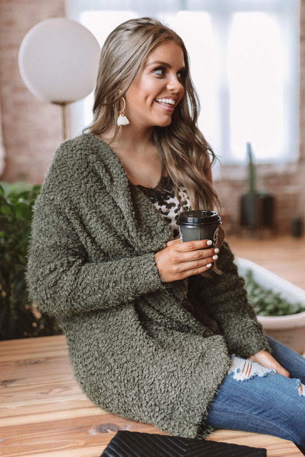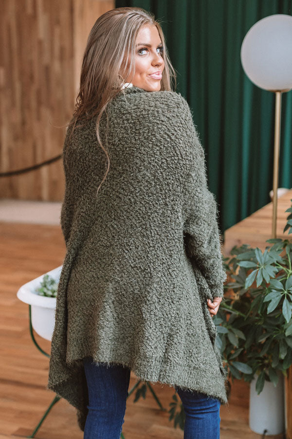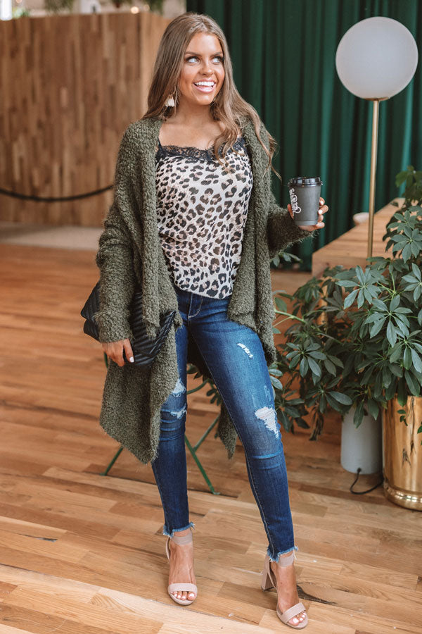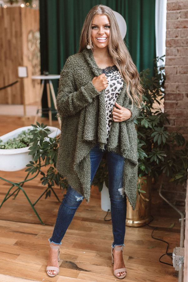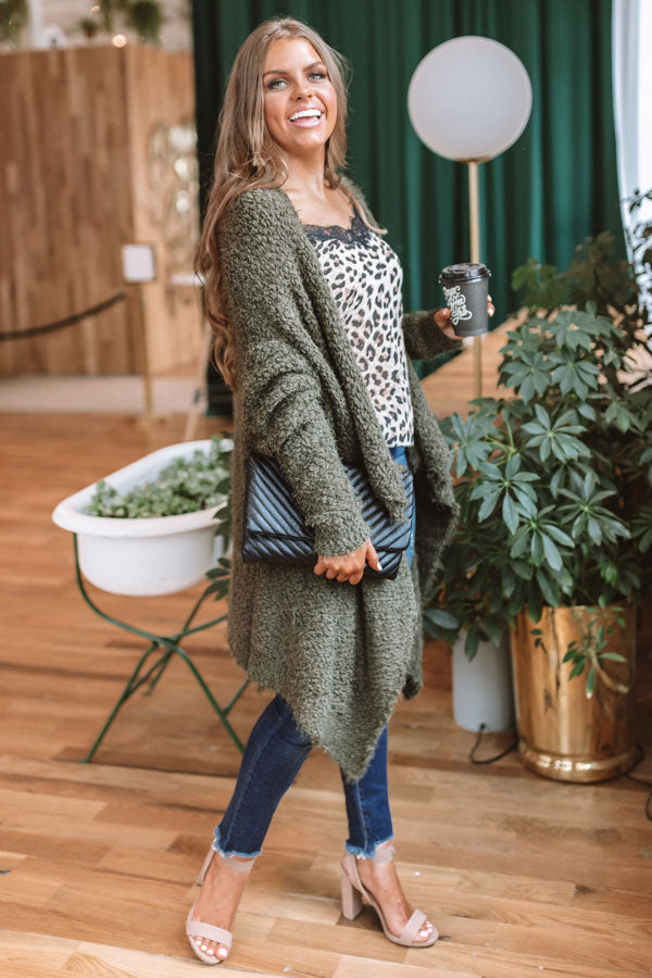 The only thing that feels better than "Carolina cuddles" is this martini olive cardigan featuring an ultra soft tight knit texture, long sleeves, a loose silhouette, and an open flap front with an uneven knee length hemline! You can style this versatile piece with just about anything from a basic tank to a sweater, jeans to dresses, wedges to sandals, clutches to totes, and hats to earrings! Here we have paired it over a basic tank with some frayed skinnies and a neutral heel! Measurements