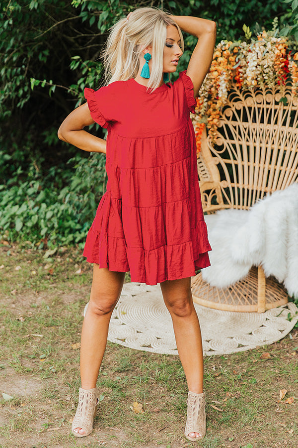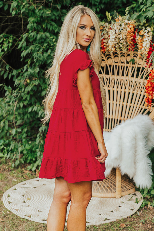 Put a little "love potion" in your motion to create an irresistible look with all the right skills! This wine dress features short sleeves with ruffled trim, a high rounded neckline, a keyhole accented upper back, and an empire cut upper bodice that falls into a tiered babydoll silhouette with a mid-thigh length uneven hemline! Style this dress with peep toe booties and statement earrings, or with "The Elena Snake Print Heel" and our "Express Yourself Faux Leather Purse in Snake Print" for a trendy transitional look with a boho personality!